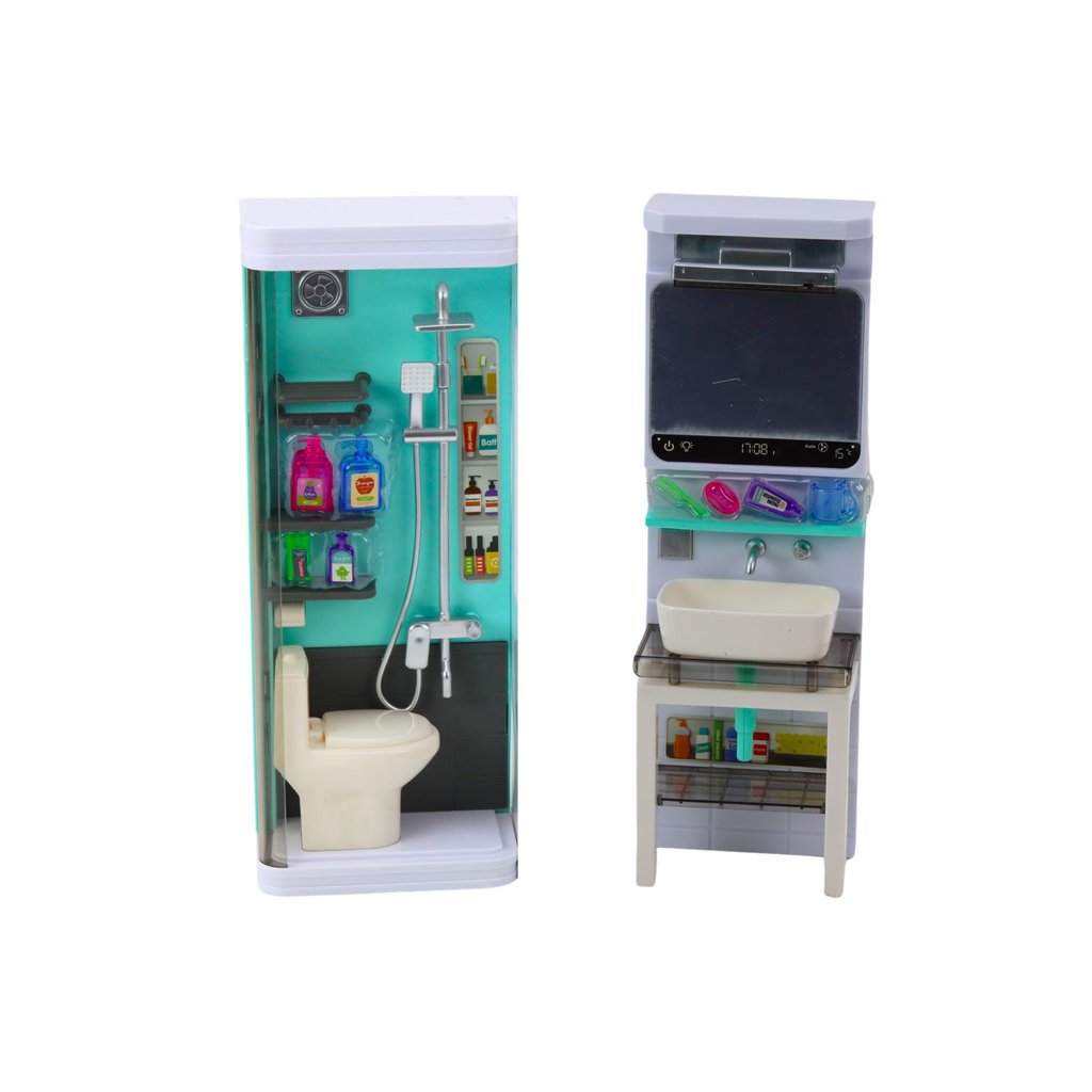 - Sprcha a záchod: Sprcha s toaletou je realisticky provedená s průhlednými dveřmi a malou toaletou s pohyblivým víkem, ideální pro hraní scén z každodenních hygienických rituálů