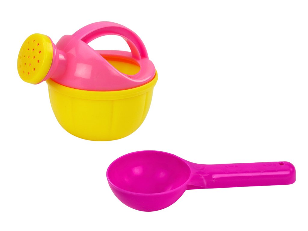 - Konvička v růžové a žluté barvě je dokonalým pomocníkem při zavlažování písku, zatímco síto poskytuje praktickou funkčnost při oddělování vody