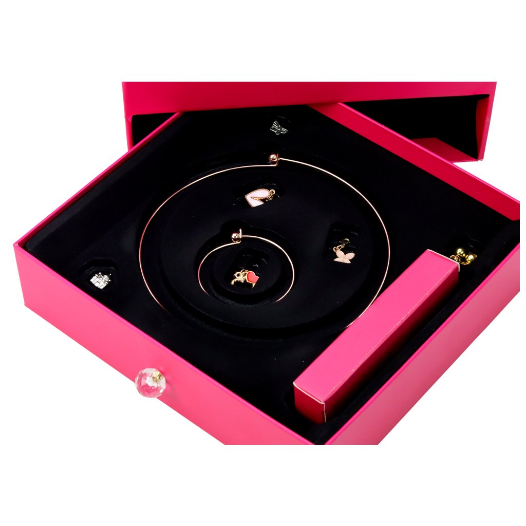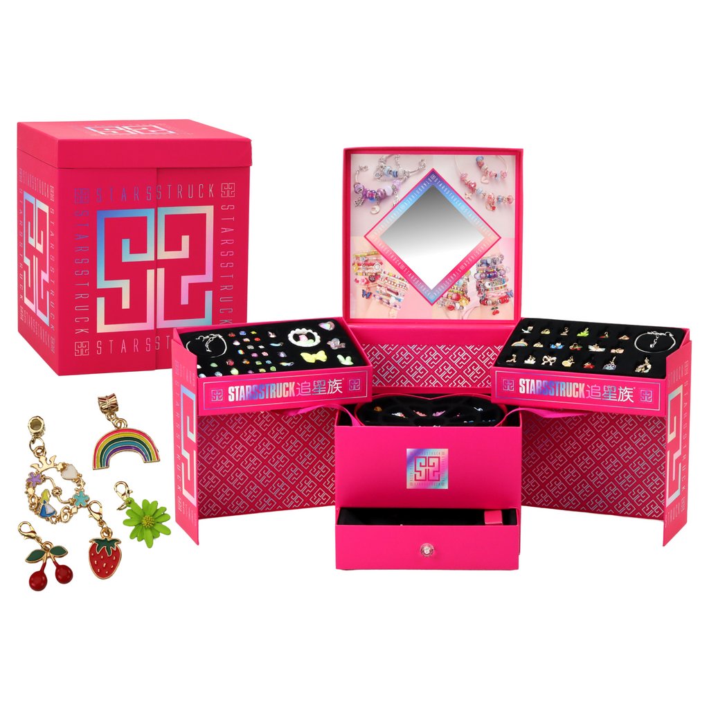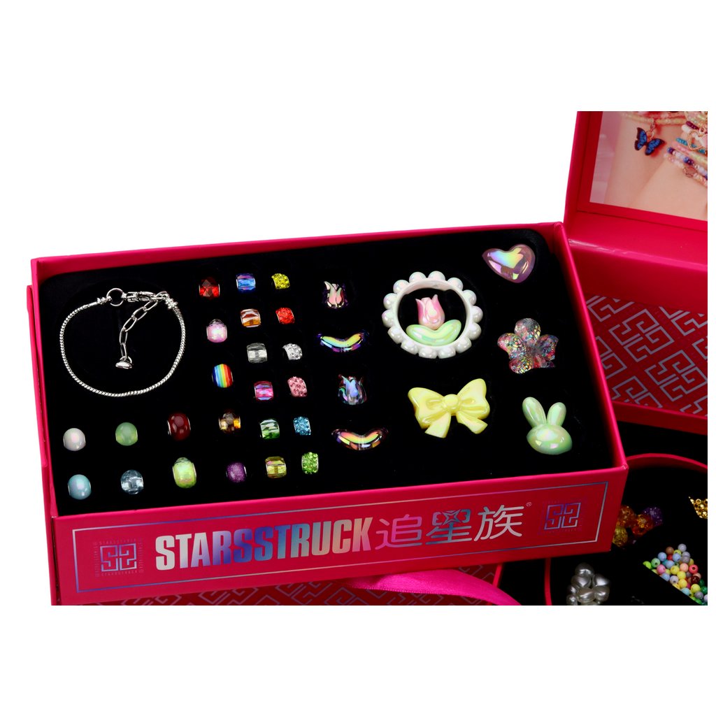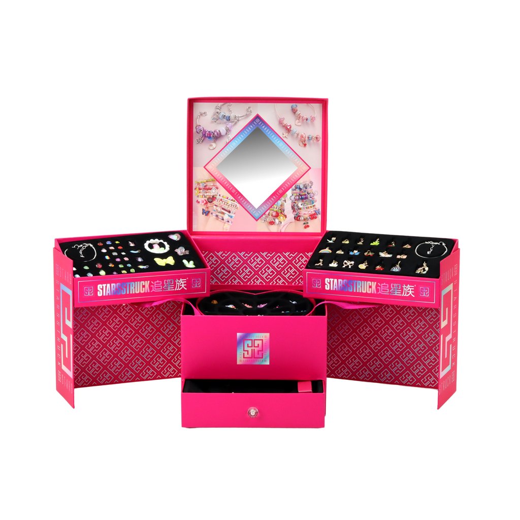 Tato jedinečná sada, zabalená ve velké čtvercové růžové krabičce o působivých rozměrech 26 cm x 23 cm x 23 cm, potěší každého malého umělce Po otevření krabičky se její stěny rozsunou a odhalí tři velké police, z nichž každá je naplněna barevnými poklady pro výrobu šperků