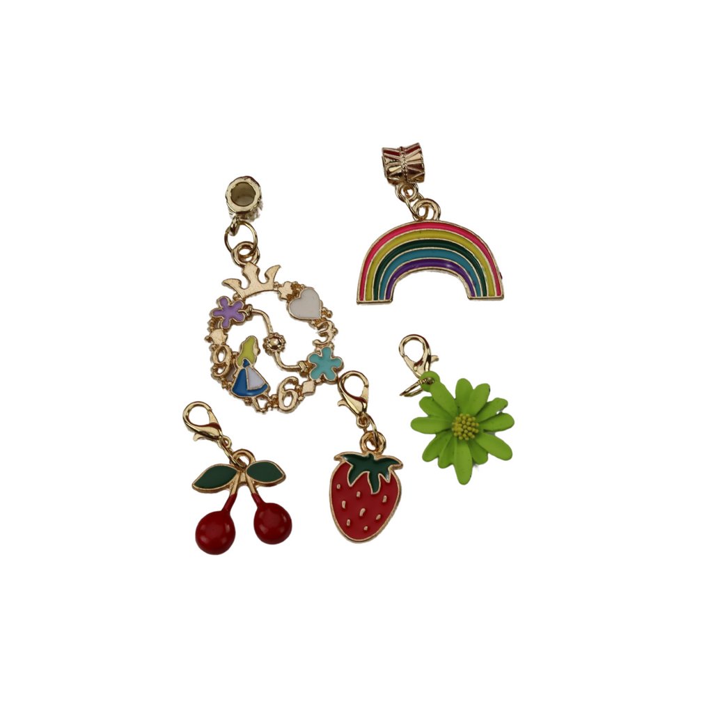 - Na první polici najdete barevné přívěsky ve tvaru motýlů, květinek a hvězdiček, které vybízejí k kreativnímu kombinování a vytváření jedinečných kompozic