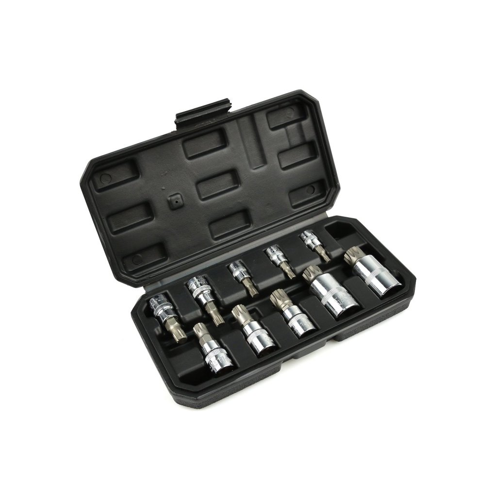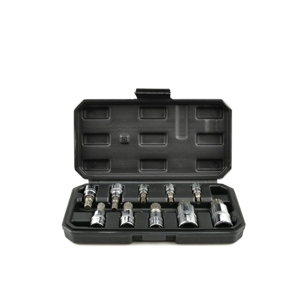 Sada spline nástavců ve velikostech M4-M18, 10 ks. Jsou vyrobeny z odolné nástrojové oceli CrV. Sada obsahuje nástavce se závitem 1/4”, 3/8” a 1/2”.