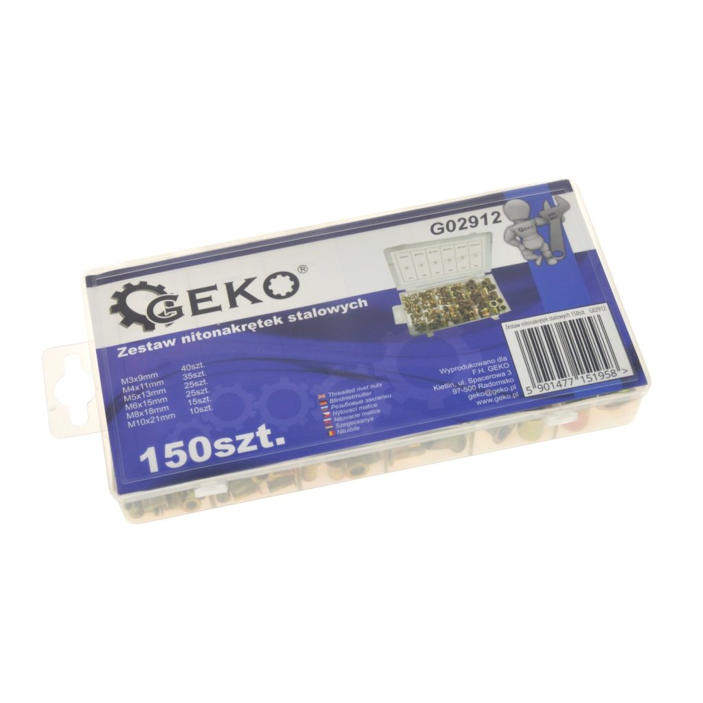 Obsah balení 40x nýtová matice M3x9 mm 35x nýtovací matice ocelová M4x11 mm 25x nýtovací matice ocelová M5x13 mm 25x nýtovací matice ocelová M6x15 mm 15x nýtovací matice ocelová M8x18 mm 10x nýtovací