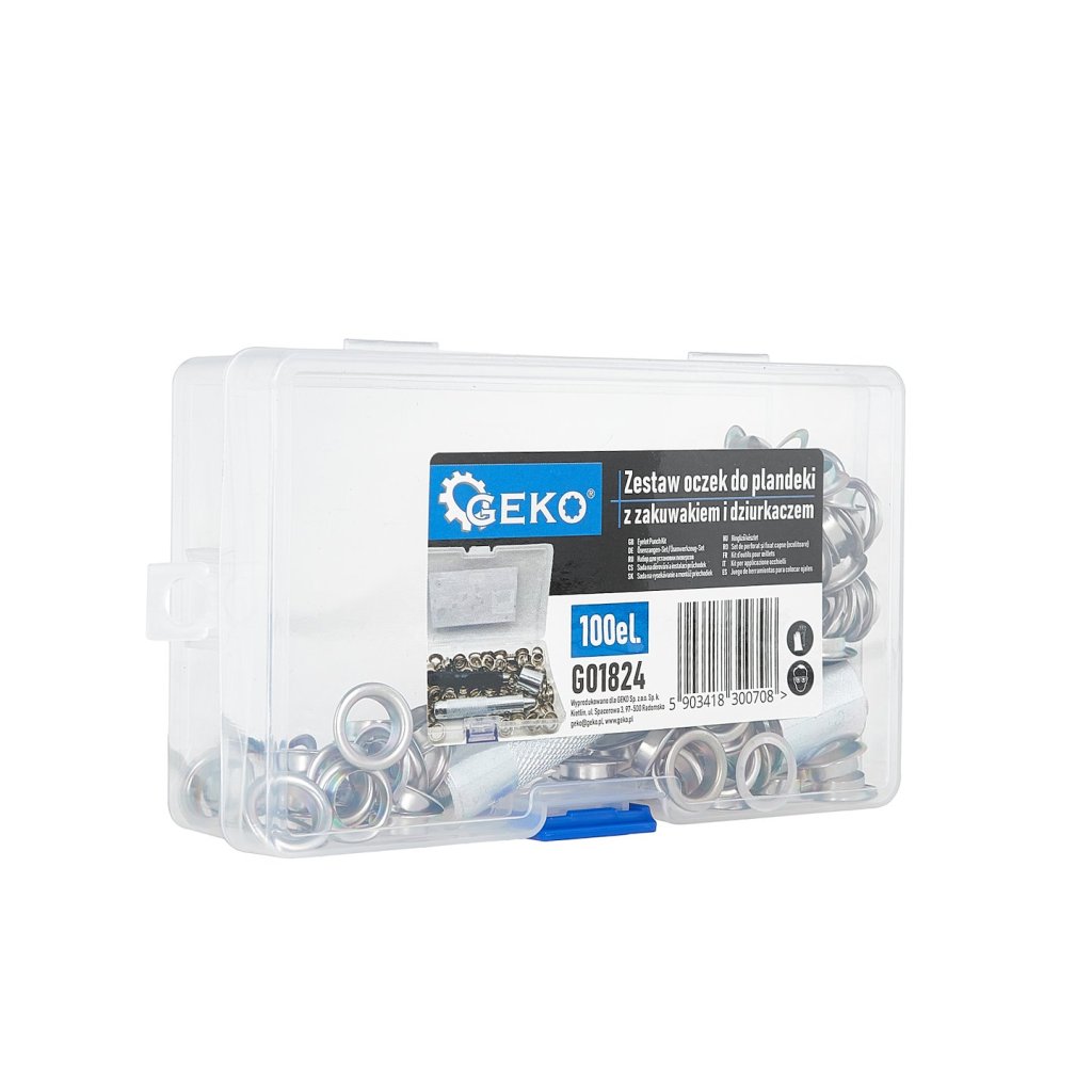 Kompletní sadaok pro plachty 100 ks + kleště + děrovač 10 mm je nepostradatelným vybavením každého kutila, dílny, zahradníka nebo firmy zabývající se montáží a opravami plachet, stanů nebo reklamních bannerů.
