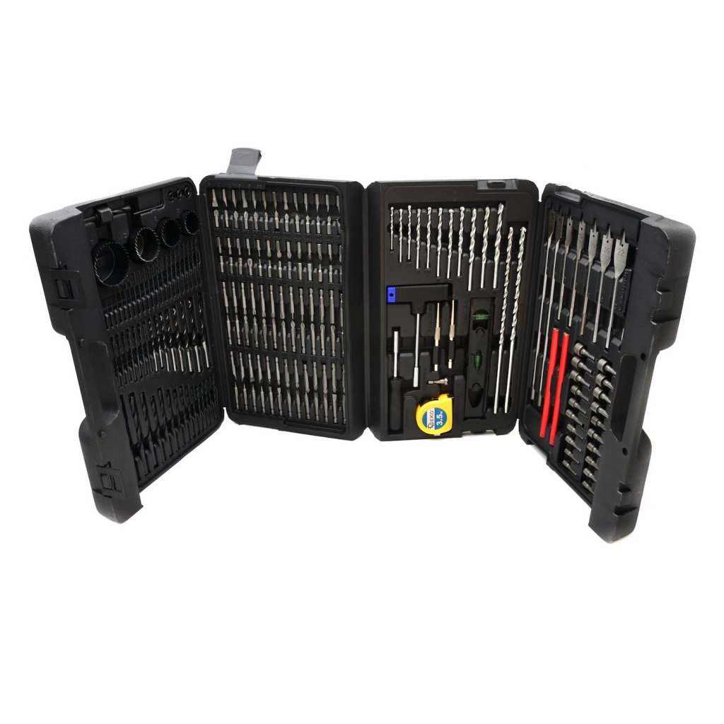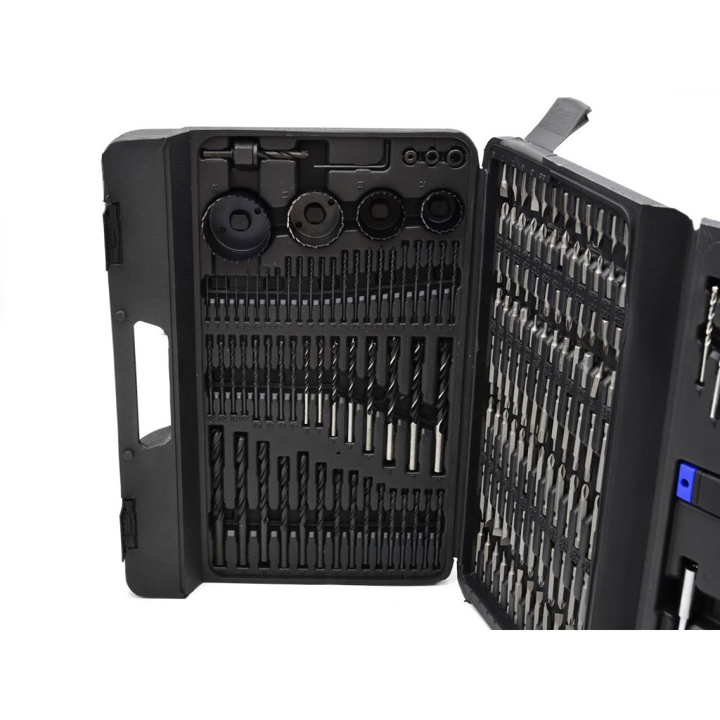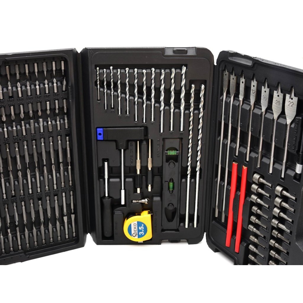 Univerzální sada příslušenství. Ideální pro kutily. Obsahuje více než 100 šroubovacích nástavců, více než 70 vrtáků a sortiment ručního nářadí.