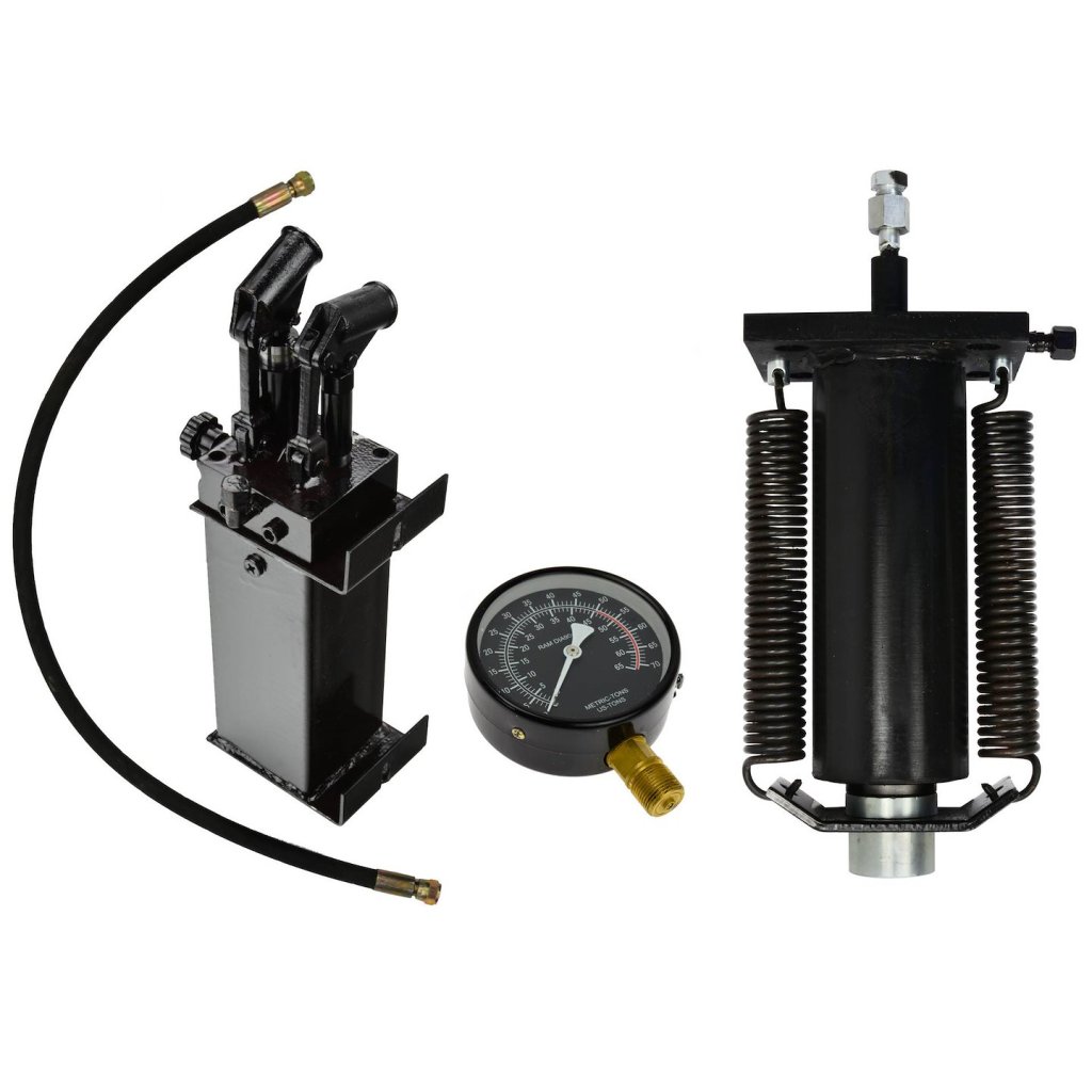 Sada pro lis 50T se skládá z válce, dvoustupňové pumpy, která umožňuje přesné dávkování síly, manometru s kalibrací v tunách a hydraulických hadic o délce 620 mm a 920 mm.