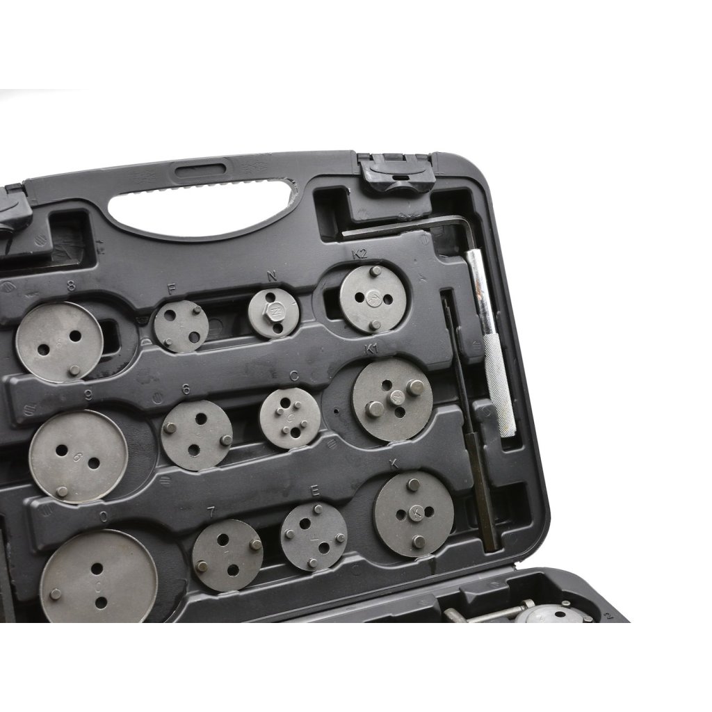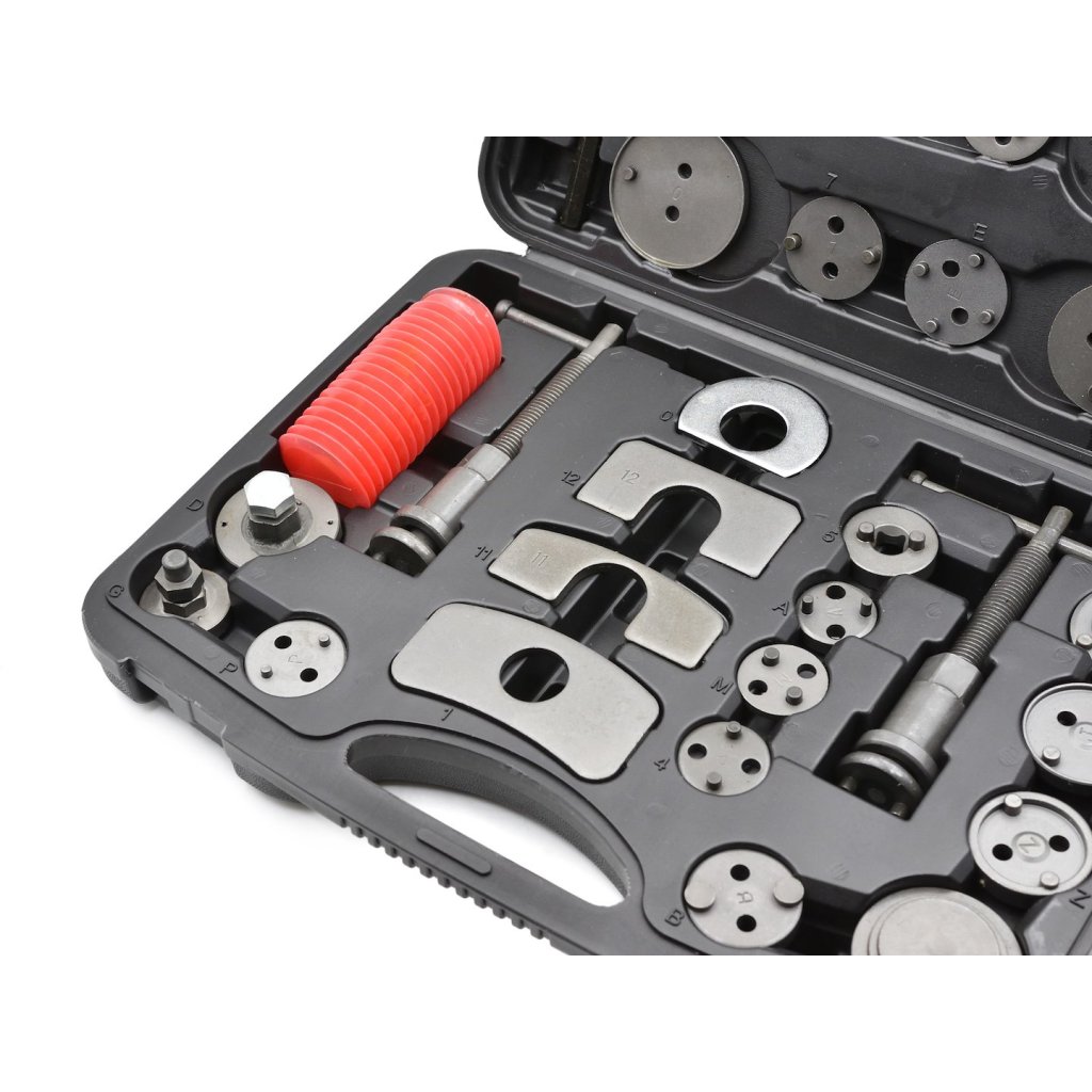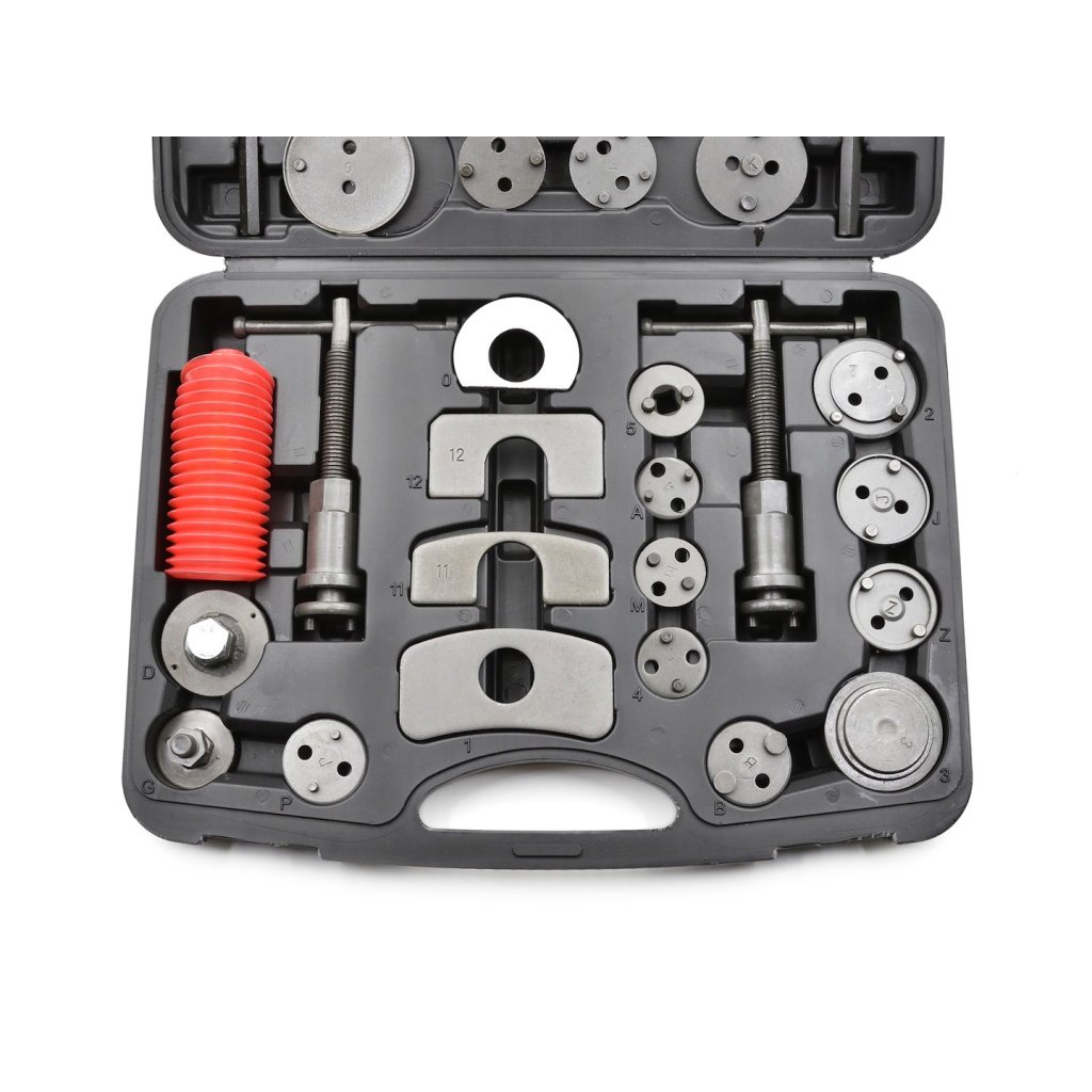 Profesionální 35dílná sada pro vytahování / stlačování brzdových pístků, nezbytná při opravách vozidel vybavených kotoučovými brzdami.