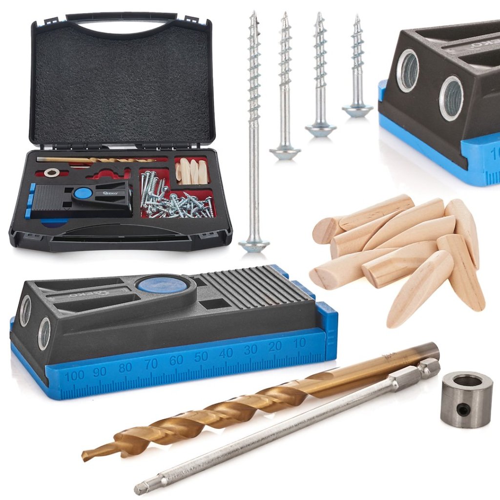 Kompletní sada pro vytváření neviditelných spojů povýkoní vrutů do dřeva. Díky sadě značky Geko vytvoříte v 3 krocích přesný a stabilní skrytý spoj. Hlavním prvkem sady je šablona určená k vytváření přesných otvorů pod správným úhlem. Dalším krokem po vyvrtání otvorů je spojení dvou dřevěných prvků povýkoní šroubů různé délky, které jsou součástí sady. Posledním krokem je zakrytí otvorů speciálními šikmými kolíky, následné oříznutí kolíků a zbroušení povrchu.