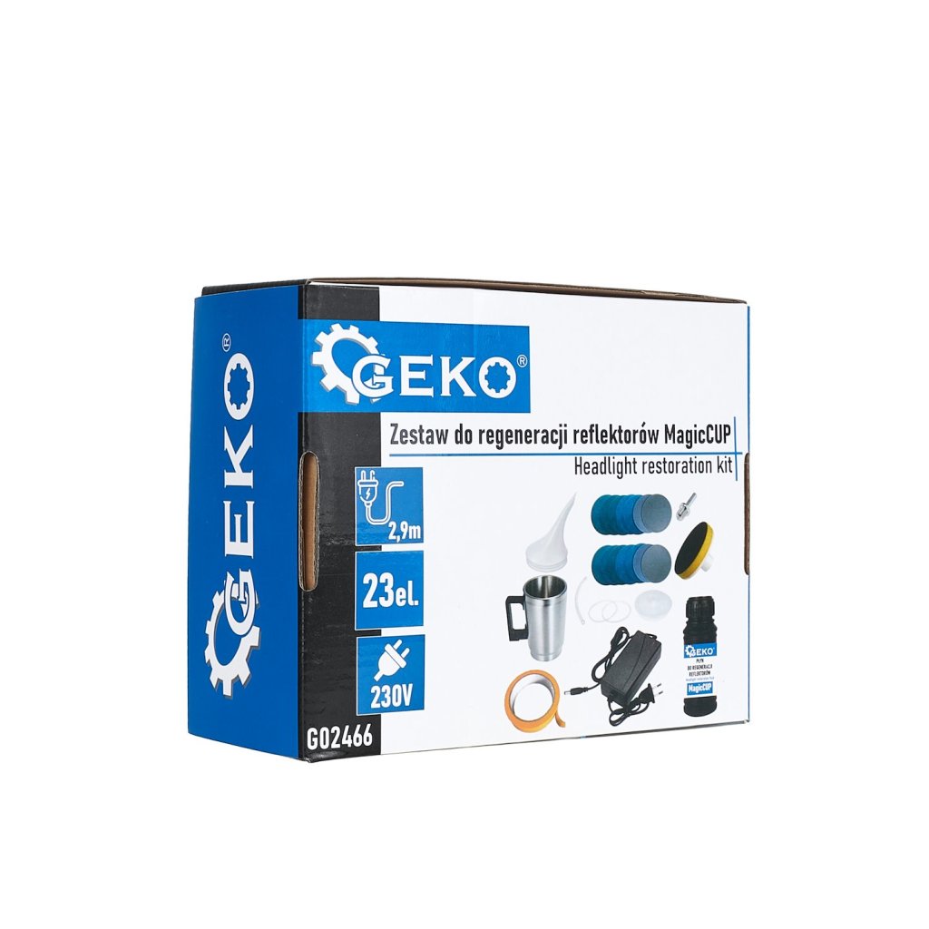 Sada pro regeneraci reflektorů MagicCUP 23-dílná je komplexní nástroj určený k profesionální renovaci a obnovení průhlednosti automobilových světlometů. Tento model značky GEKO zaručuje účinné odstranění matných míst, škrábanců a zabarvení ze světlometů, čímž jim vrací původní průhlednost a zlepšuje estetiku vozidla. MagicCUP je ideálním řešením jak pro profesionály, tak pro domácí kutily.