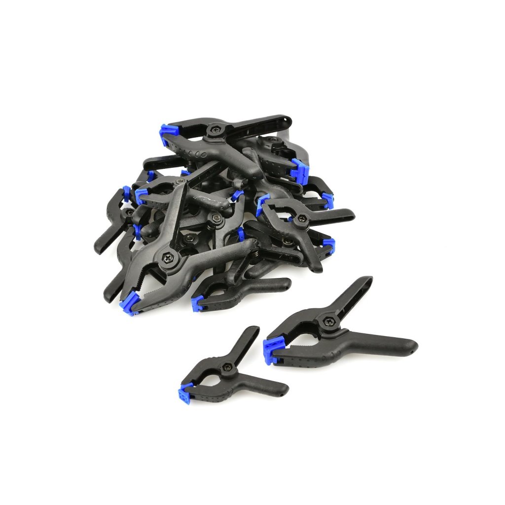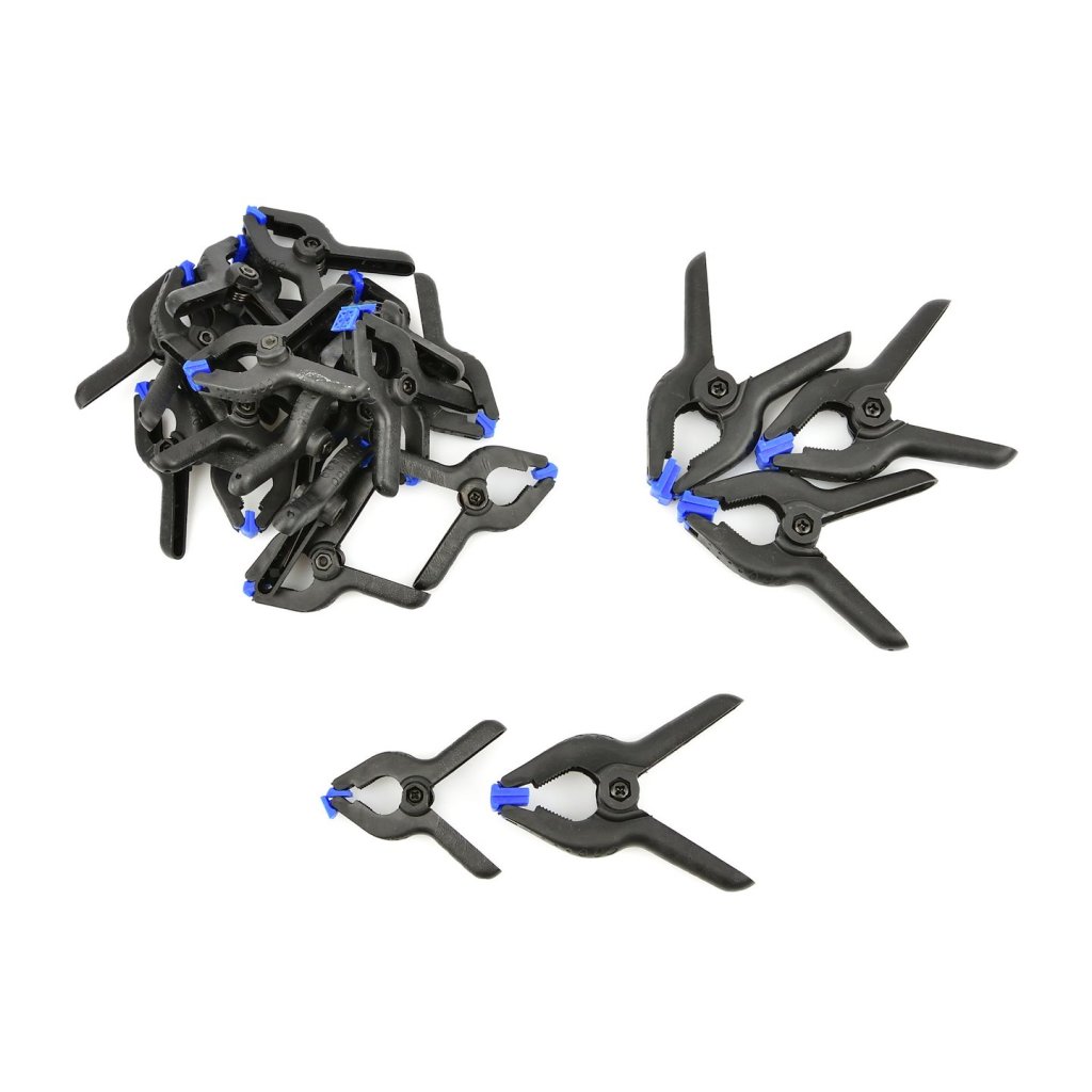 Sada 22 ks pružinových svorek vyrobených z odolného plastu, vybavených silnou ocelovou pružinou a výkyvnými čelistmi, které se přizpůsobují stlačované ploše. Skvěle se hodí například při lepení různých druhů prvků.