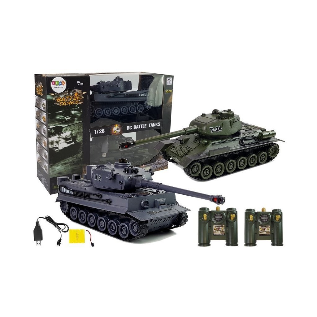 Pokud má vaše dítě rádo vojsko a vojenské motivy, tato sada je ideálním dárkem pro něj. Díky této hračce se každé dítě může cítit jako hrdina na skutečném bojišti. S radostí doporučujeme sadu dvou dálkově ovládaných tanků jak dětem, tak rodičům. Repliky tanků T-34 a TIGER 103 v měřítku 1:28 jsou opravdovým klenotem pro uživatele v každém věku. Vyrobené z pevného plastu, tyto vozidla disponují pohyblivou věžičkou s dělem a pomocí ovladačů je můžete řídit vpřed, vzad a zatáčet. Skutečná zábava začíná, když najdete důstojného soupeře. Po spuštění funkce válečné hry máte možnost střelecky se utkat s protivníkem. Na tanku je umístěn vysílač a přijímač infračerveného záření, které umožňují vzájemný střet. Úkolem tankisty je vyhýbat se střelbě a současně provádět bezpečné výstřely směrem k nepříteli. Tanky mají ukazatele počtu jejich životních bodů, které se snižují při obdržení poškození. Po prvním zásahu dojde k „poškození“ levého pásu, což znemožňuje zatáčení. Po druhém zásahu se tank již nepohybuje, lze pouze ovládat věžičku. Třetí zásah znamená prohru v duelu. Po obdržení zásahu má tank několikasekundovou imunitu vůči poškození. Tanky pracují na frekvenci 27Mhz.