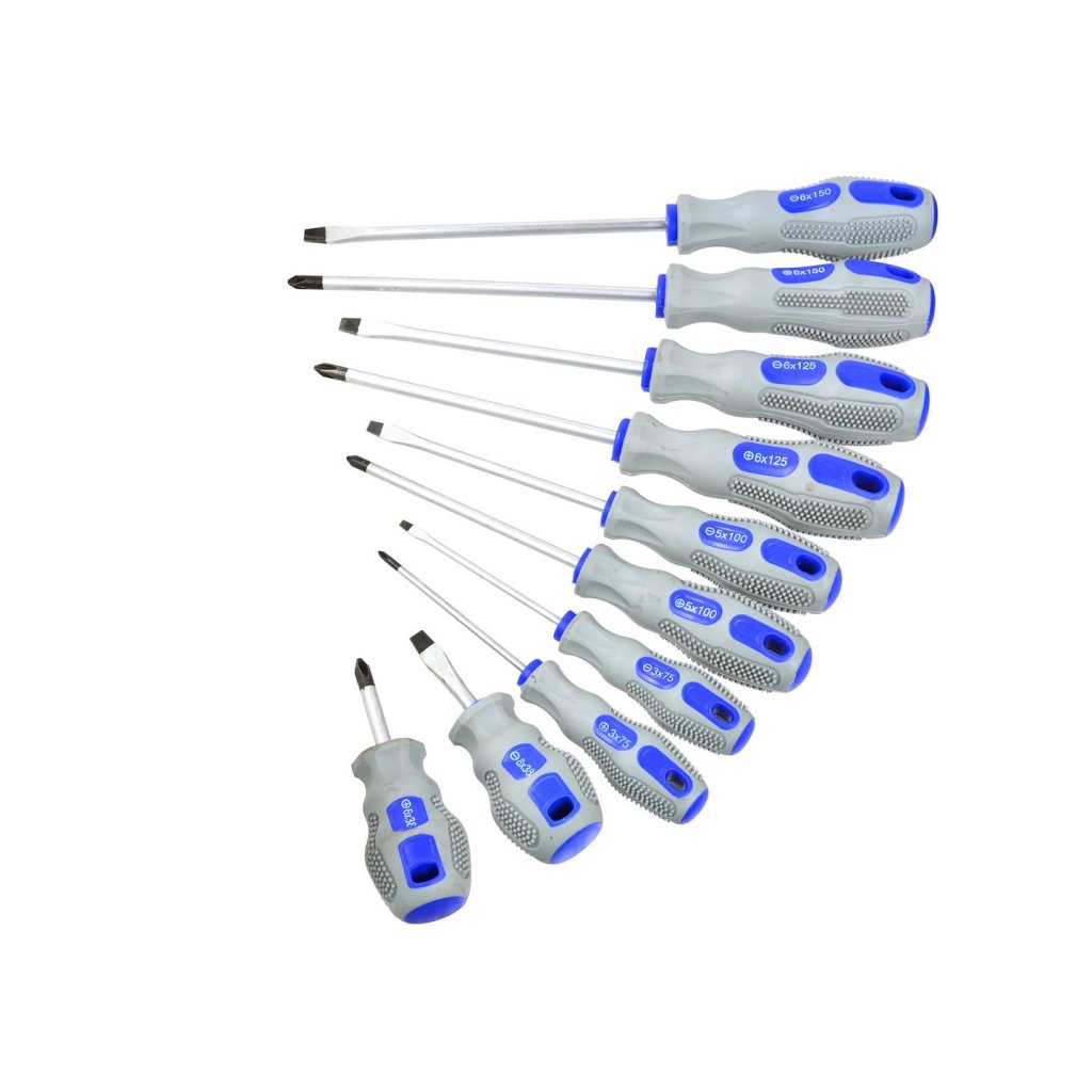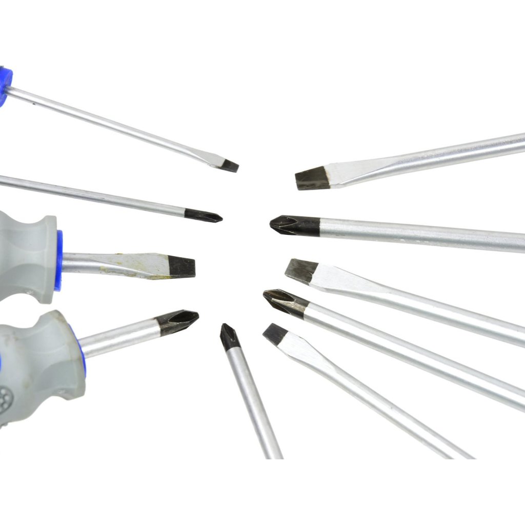 Profesionální sada šroubováků 10 ks, vyrobená z chrom-vanadové oceli (CrV), díky čemuž jsou mimořádně odolné. Sada obsahuje dva druhy šroubováků (křížový, plochý) v různých velikostech.
