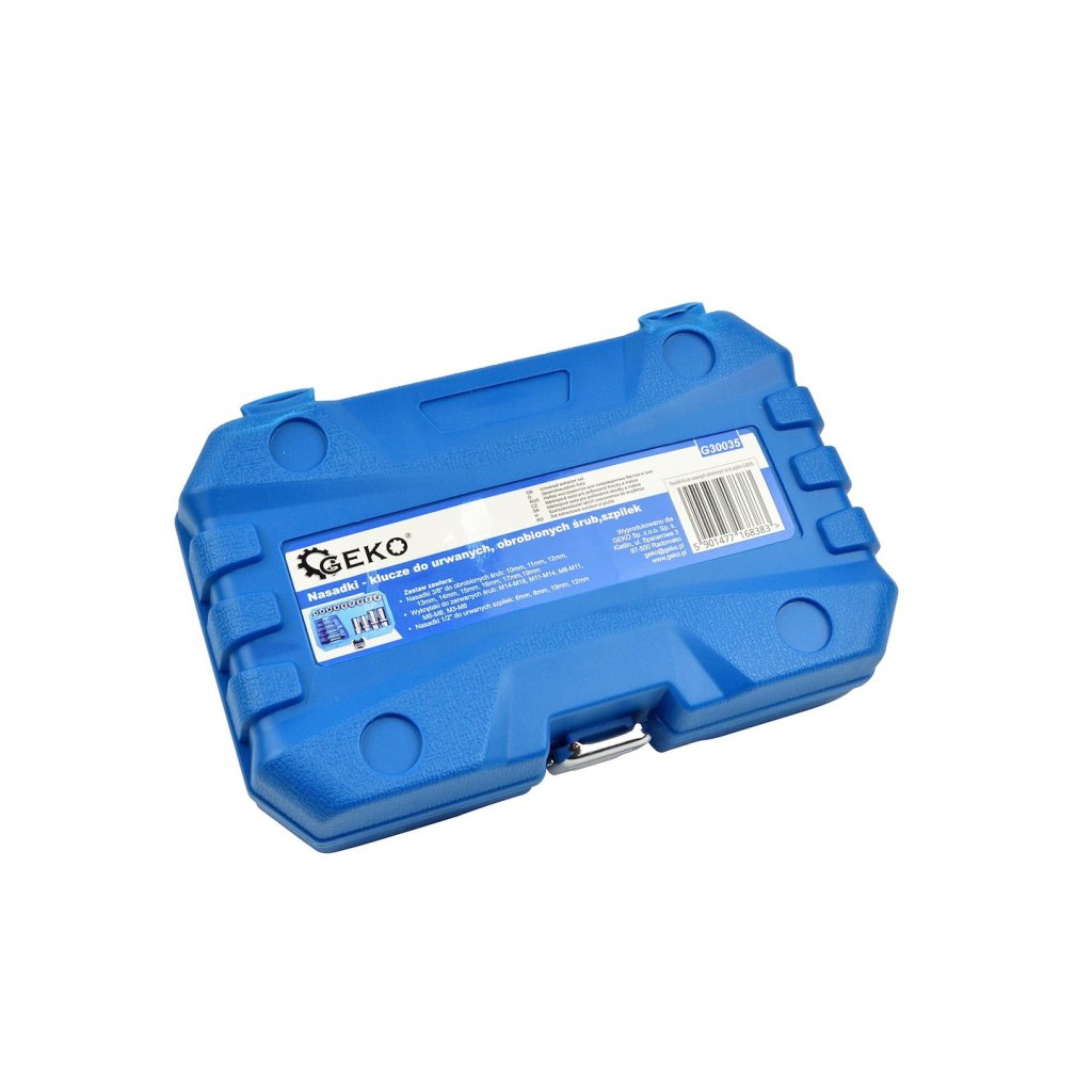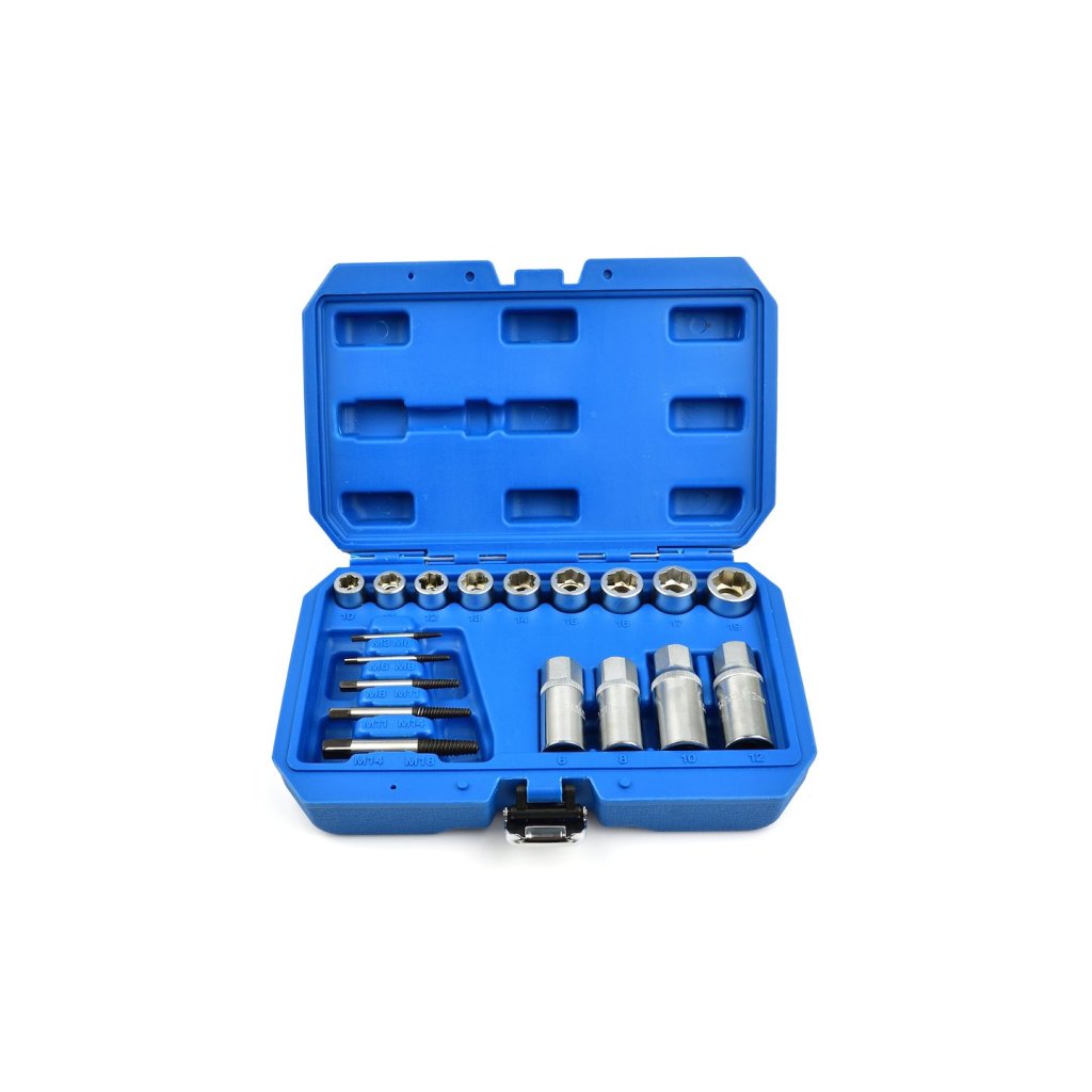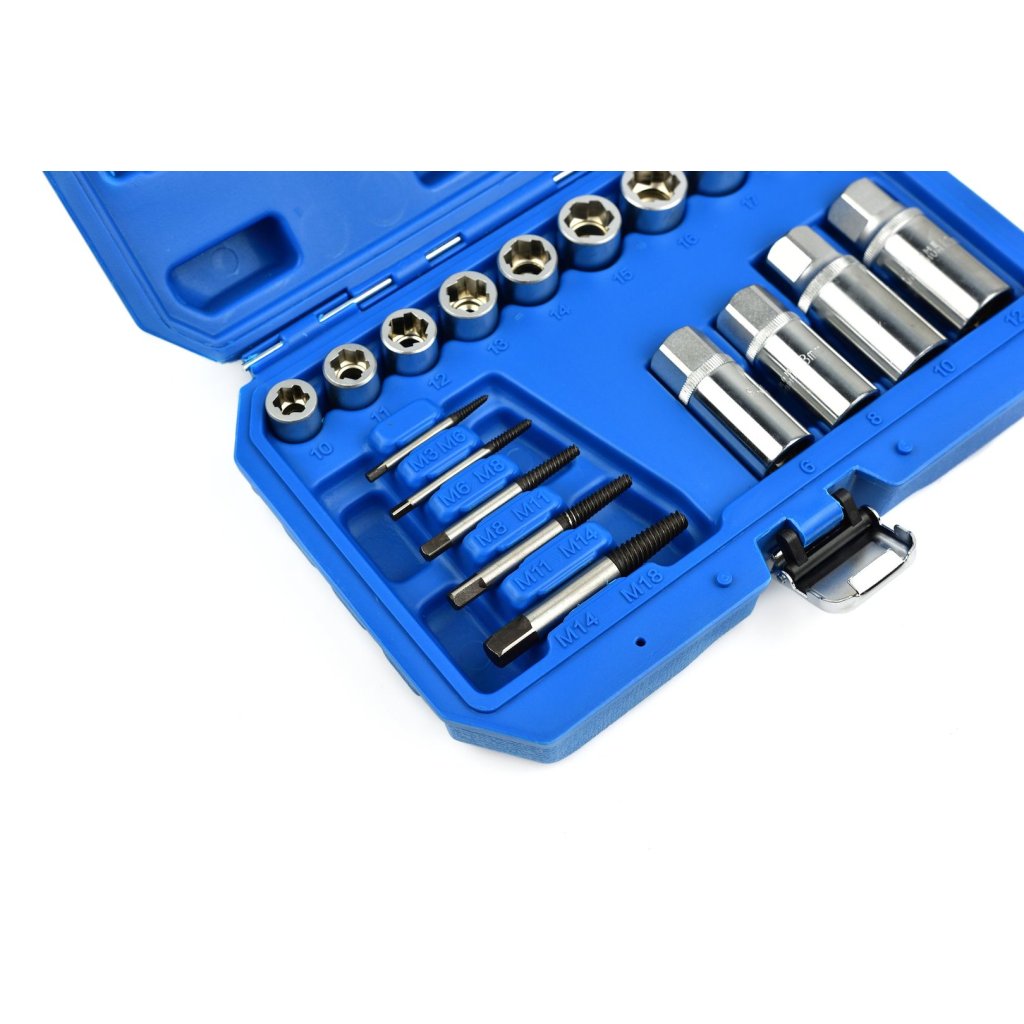 Sada nástrčných klíčů a šroubováků pro poškozené šrouby, poškozené matice a ulomené čepy. Součástí 18dílné sady je sada 3/8” nástrčných klíčů pro odšroubování poškozených/obrobených matic, sada šroubováků pro utržené šrouby a sada 1/2” nástrčných klíčů pro vytažení utržených čepů.