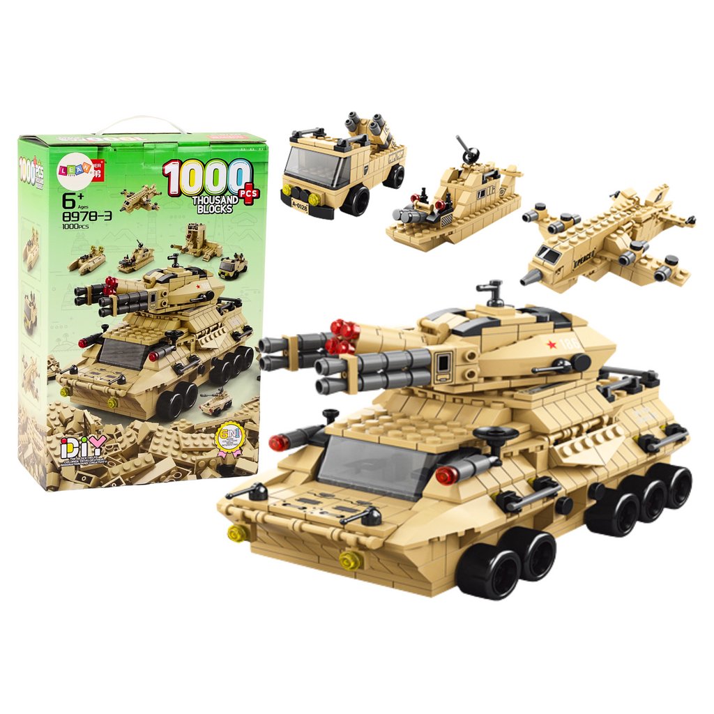 Sada Stavebnic Vojenský Tank Písečný 1000 Ks je ideální pro všechny nadšence do vojenské techniky a modelářství Tento stavebnicový set obsahuje 1000 precizně zpracovaných dílků, díky kterým můžete postavit nejen impozantní model tanku, ale také další vojenské stroje jako jsou stíhačky, helikoptéry, katapulty a ponorky