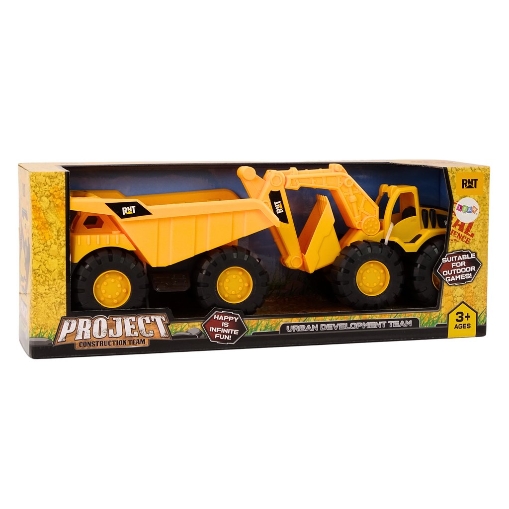 - Žlutý bagr s pohyblivou lopatou a robustní sklápečka společně zajistí neomezenou zábavu plnou objevování a učení