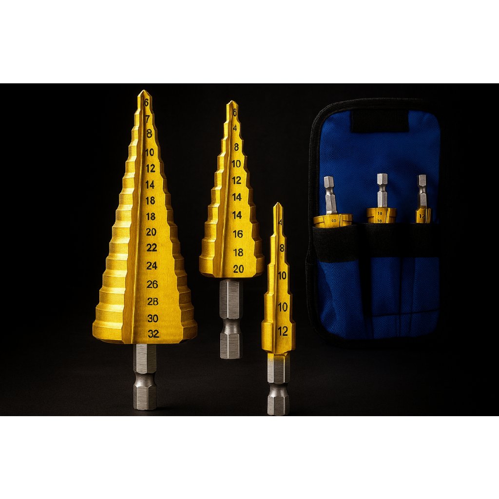 Sada titanových stupňovitých vrtáků 4–32 mm (3 ks, HEX)