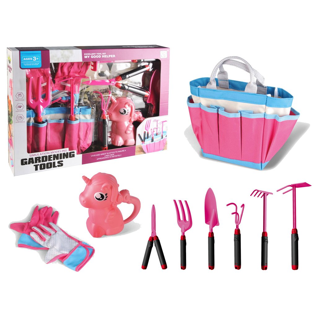 - Zahradní sada je v roztomilé růžové barvě s konevem ve tvaru jednorožce, který dodává sadě pohádkový charakter