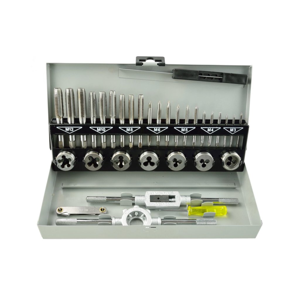 Moderní sada závitníků a závitořezů M3 - M12. Sada obsahuje 32 různých nástrojů vyrobených z vysoce kvalitní oceli.