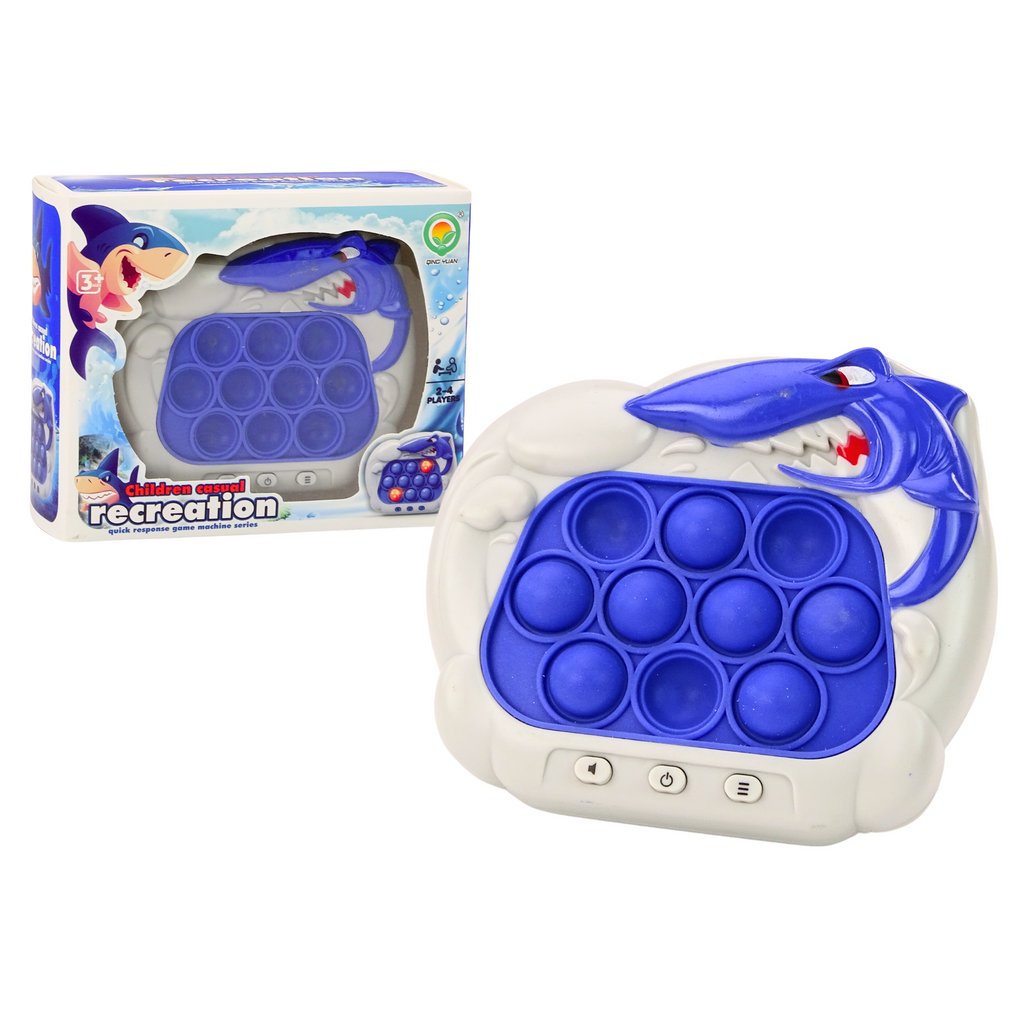- Herní senzorová konzole Pop-It Žralok v modré barvě je inovativní zařízení, které kombinuje klasickou zábavu s moderními funkcemi