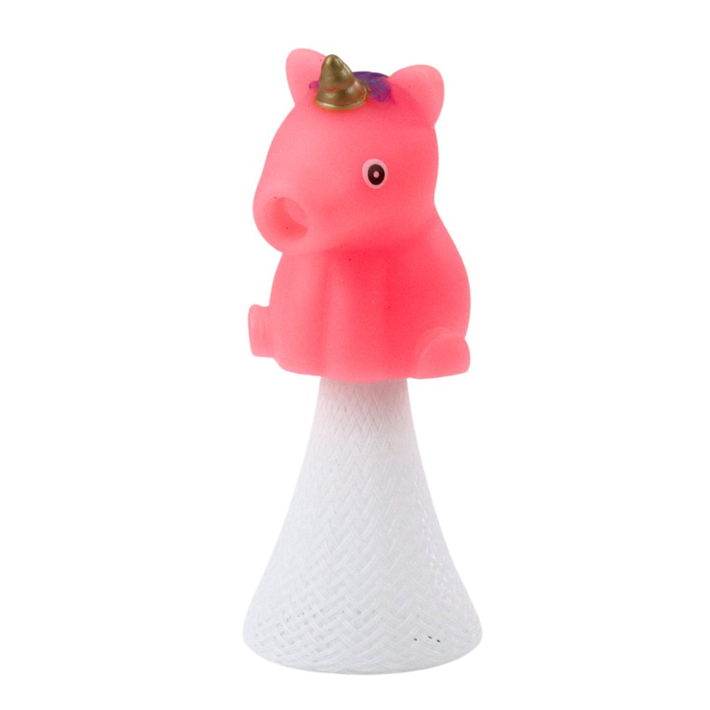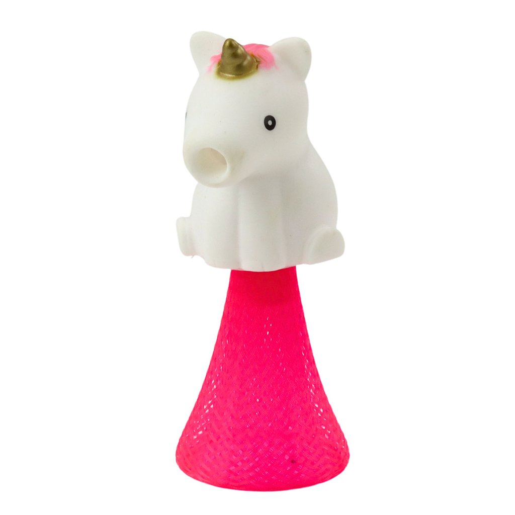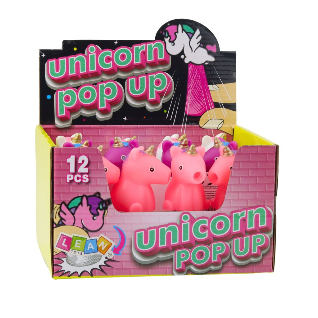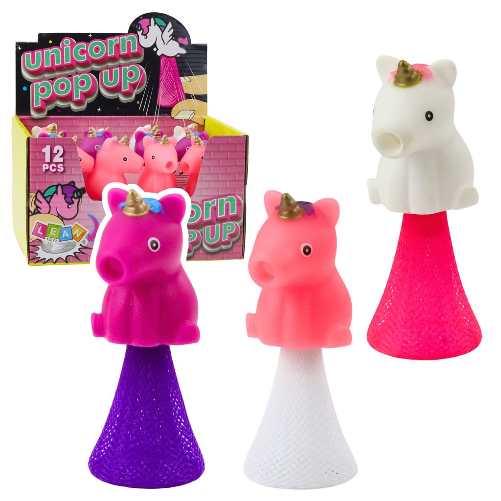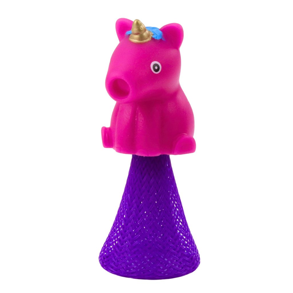 Figurka jednorožce je umístěna na pružné, elastické síti po stisknutí a uvolnění hračka vyskočí vzhůru, což malé děti překvapí a rozveselí