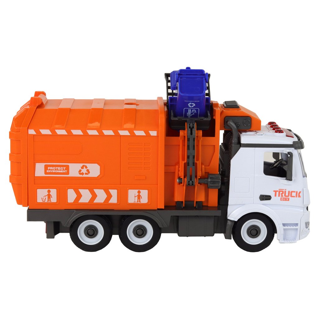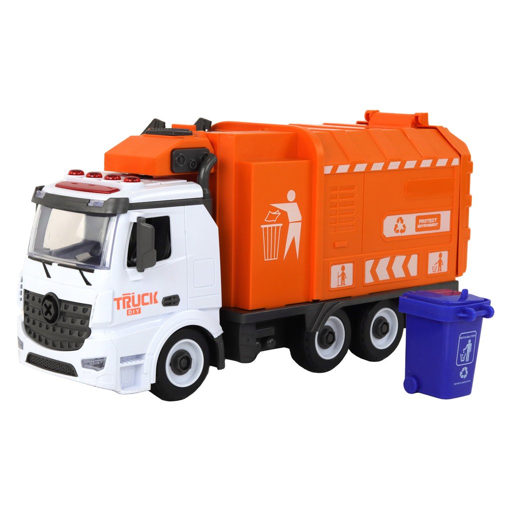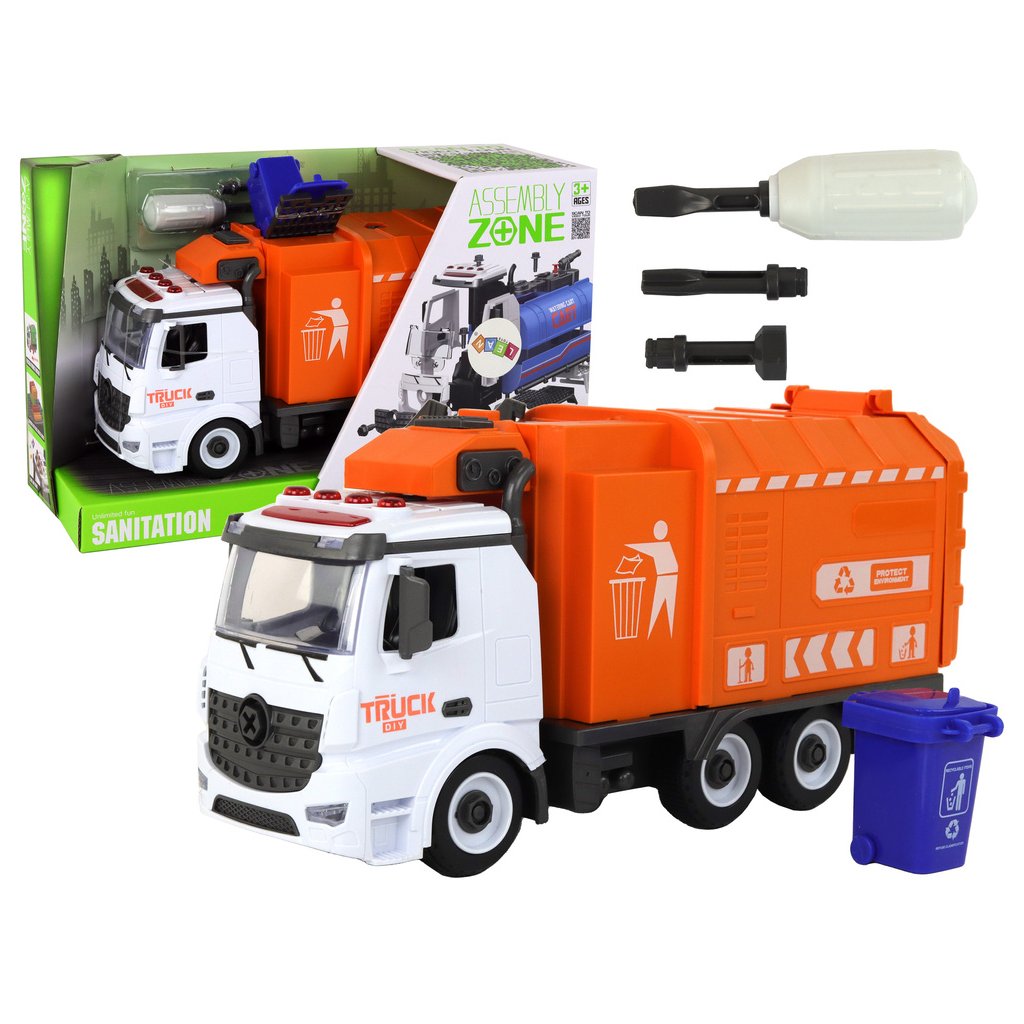 - Popelářské auto Sorter Segregacja DIY sada Šroubovák Zvuk Popelářské auto je v oranžovo-bílé barvě a přesně kopíruje vzhled skutečného popelářského auta