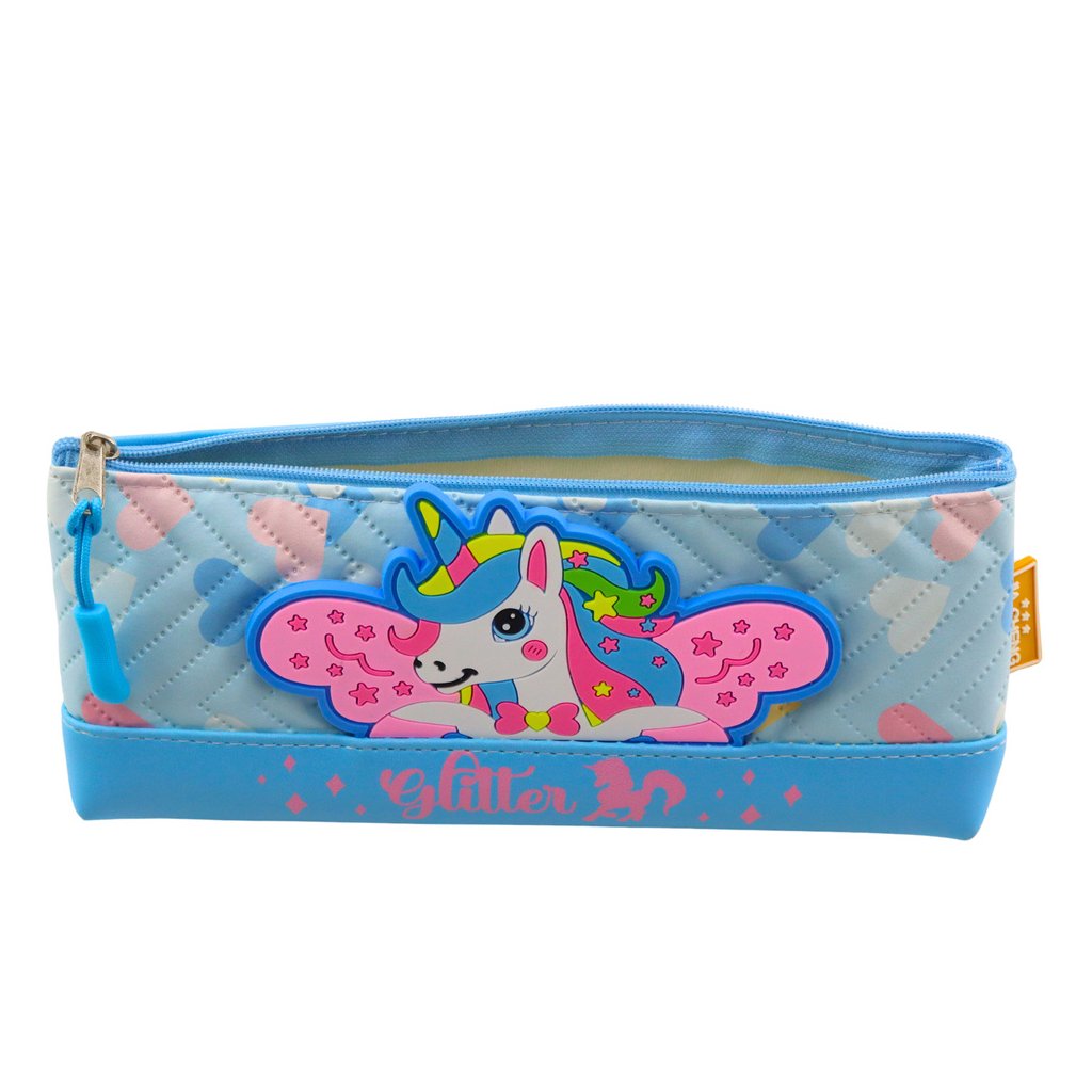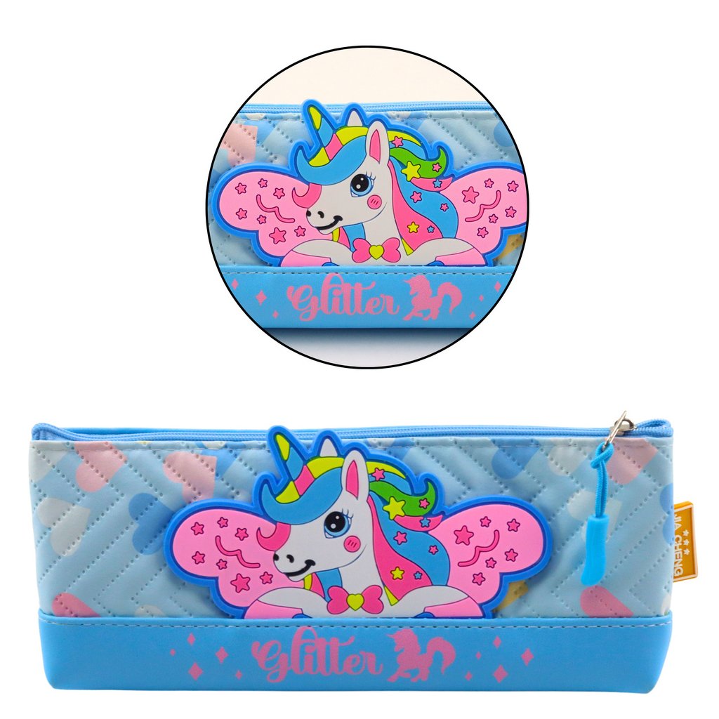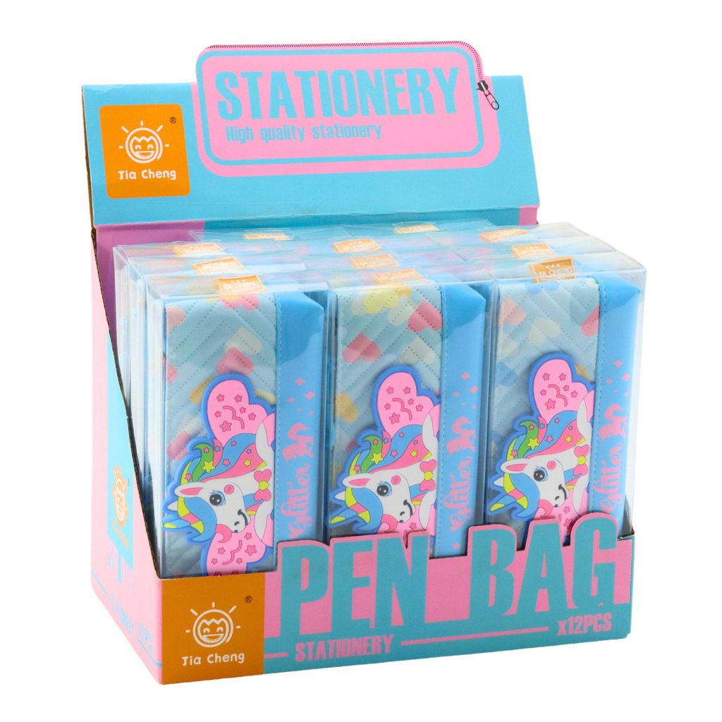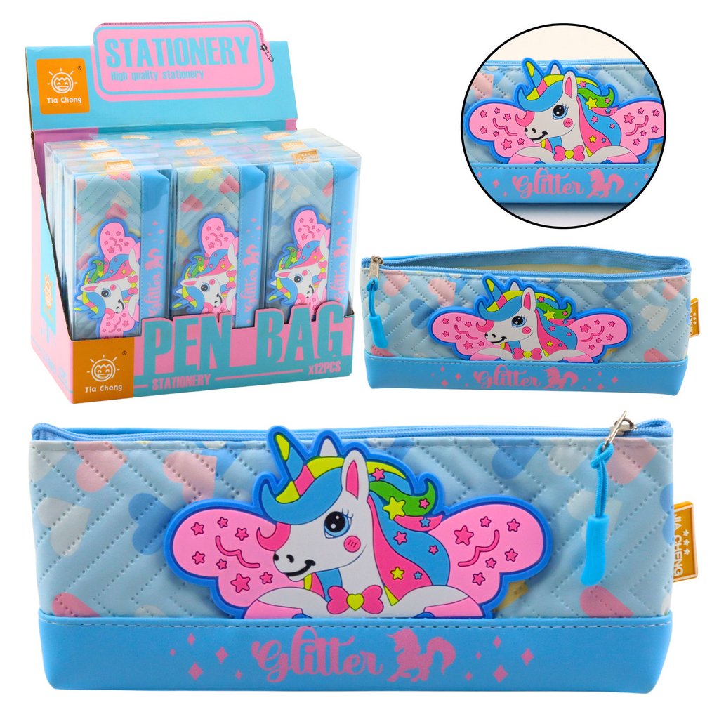 Pouzdro na tužky s motivem jednorožce v modré barvě Nádherné pouzdro s motivem jednorožce, vyrobené z materiálu připomínajícího kůži, ideální pro ukládání školních potřeb Měkké, odolné a bezpečné, splňující normy CE a EN71