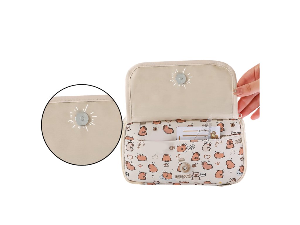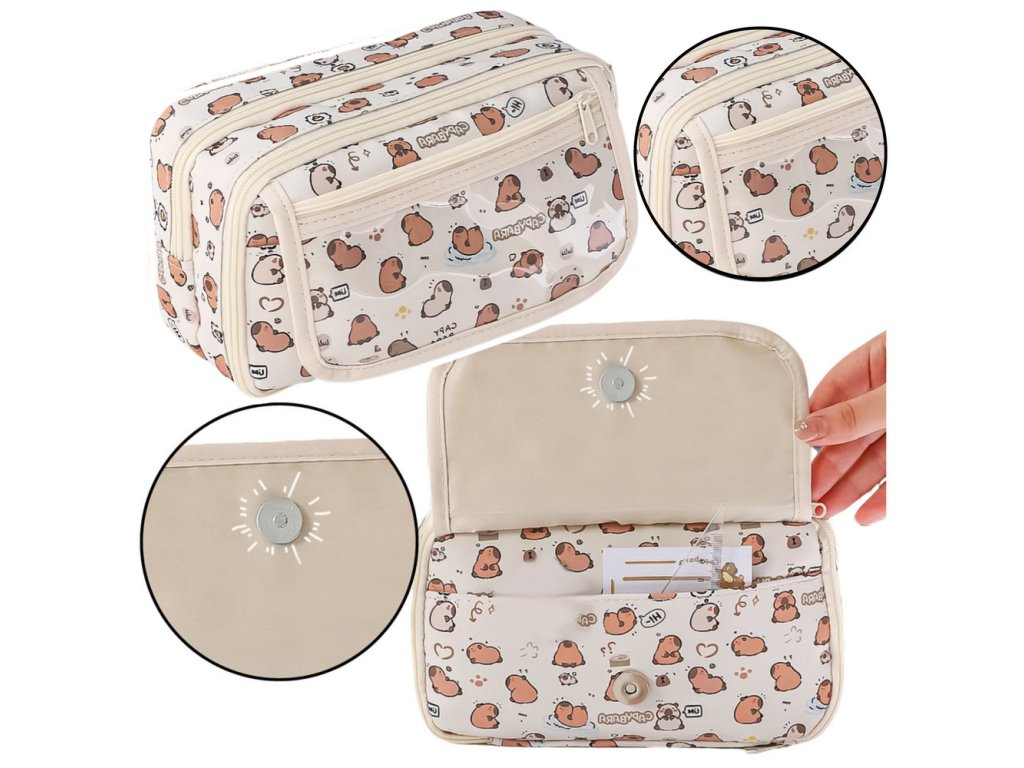 Školní pouzdro s kapibary, bílé je ideální volbou pro studenty, kteří ocení praktický a rozkošný design. V krémové barvě s obrázky sympatických kapibar toto pouzdro snadno vynikne mezi ostatními školními potřebami. Hodí se do školy, na univerzitu, pro výtvarné činnosti nebo pro domácí pracovní stůl.