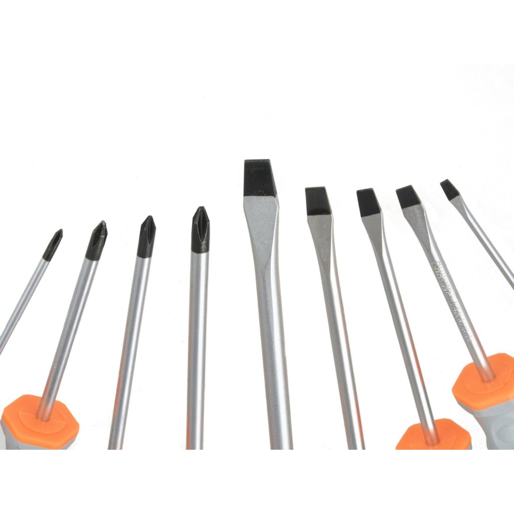 Sada 9 kusů šroubováků vyrobených z vysoce kvalitní chrom-vanadové oceli (CrV), díky čemuž jsou mimořádně odolné. Sada obsahuje dva typy šroubováků (křížový PH, plochý) v různých velikostech.