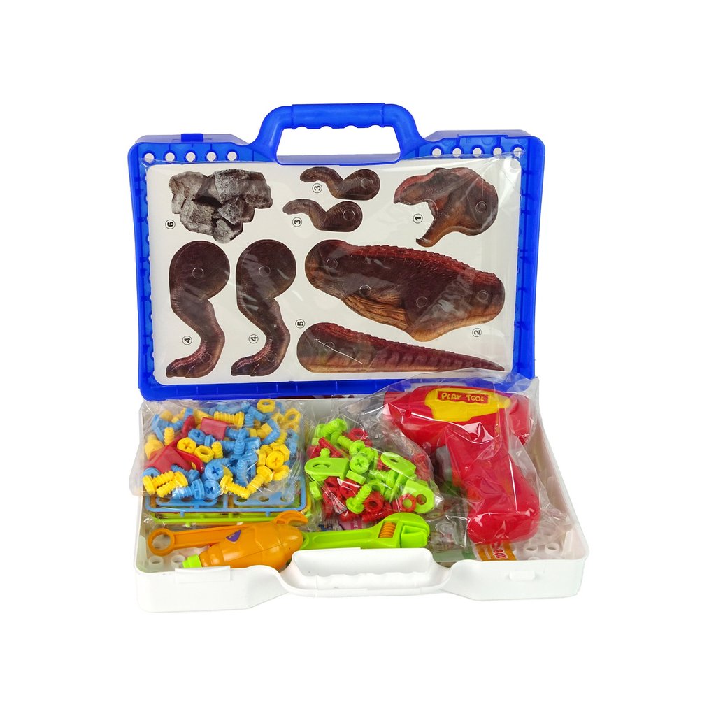 Sada obsahuje 2 desky s částmi těla dinosaura a 8 desek s figurkami, které lze sestavit do různých konfigurací Navíc je v sadě plastové barevné šroubky, zátky a hračka v podobě vrtačky, šroubováku a 2 klíčů