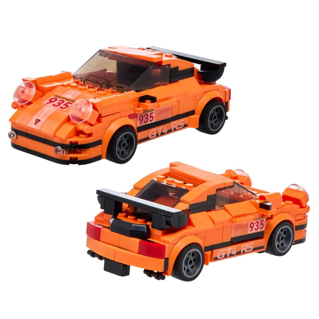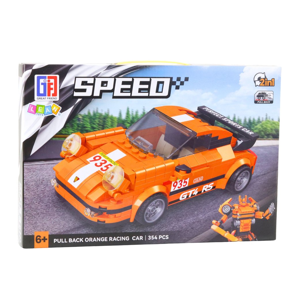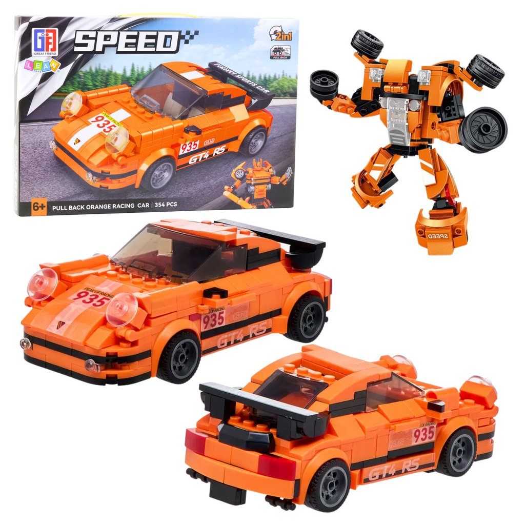 SPEED PULL BACK ORANGE RACING CAR – STAVEBNICE 2v1 AUTO + ROBOT 354 DÍLŮ