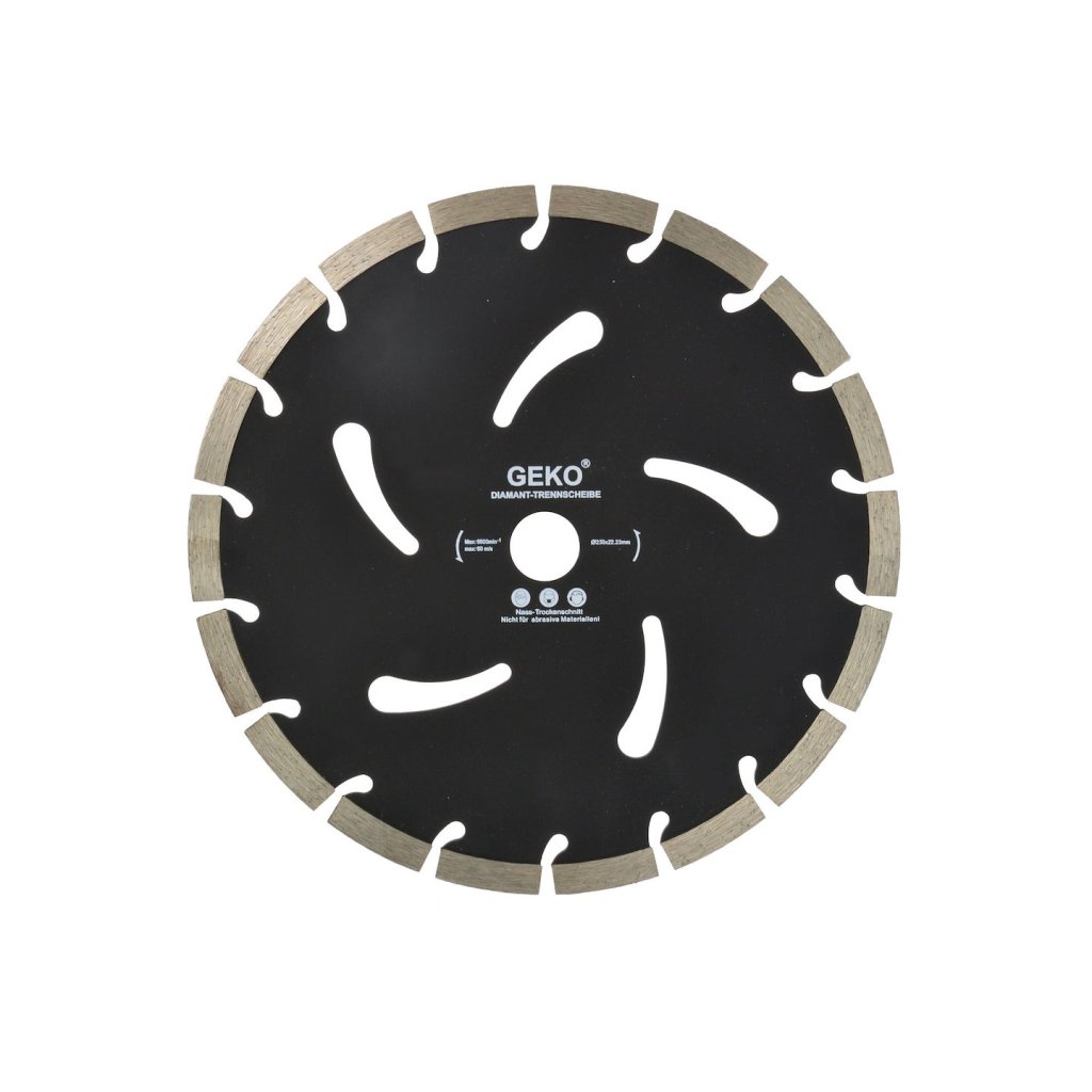 Diamantový kotouč pro obrábění stavebních materiálů, jako je beton, železobeton, cihly, dlažební kostky, klinker, porobeton, keramické dlaždice. Kotouč s velmi vysokým obsahem diamantu, díky čemuž má velmi dobré řezné vlastnosti, nepřehřívá se a nevytváří jiskry.