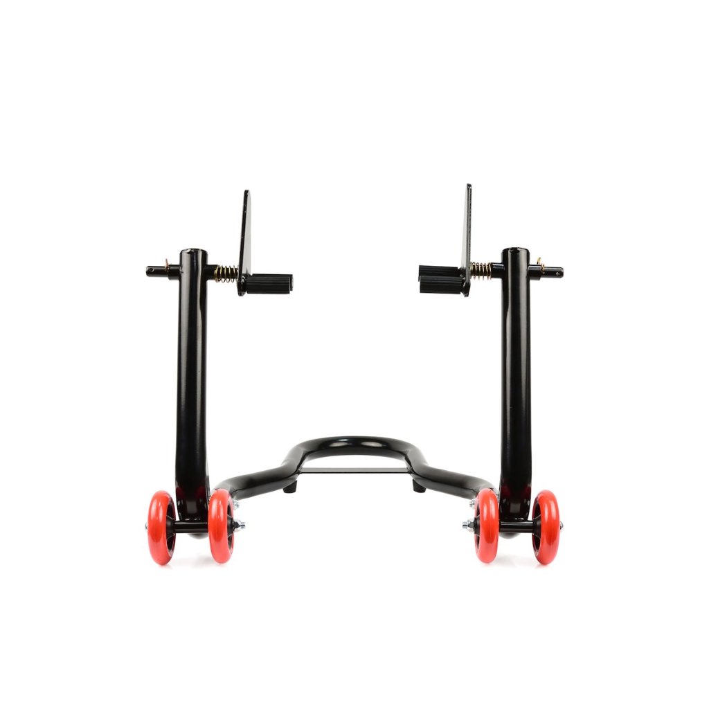 Zesílený stojan na motocykl pod přední nápravu. K výrobě byla použita ocelová trubka o průměru 32 mm s práškovým lakováním. Zesílená konstrukce stojanu navíc zaručuje stabilní a bezpečné zvedání motocyklu. Kolečka jsou vyrobena z vysoce kvalitního ABS plastu.