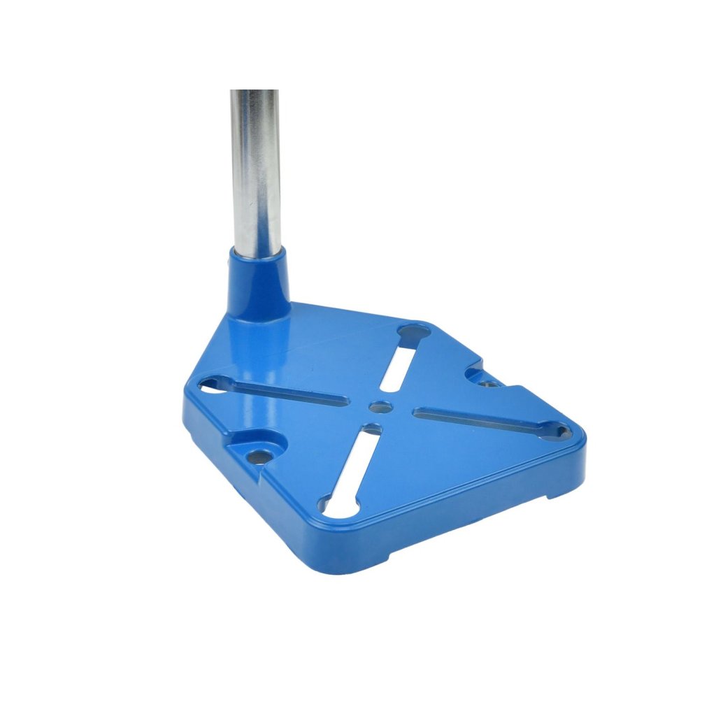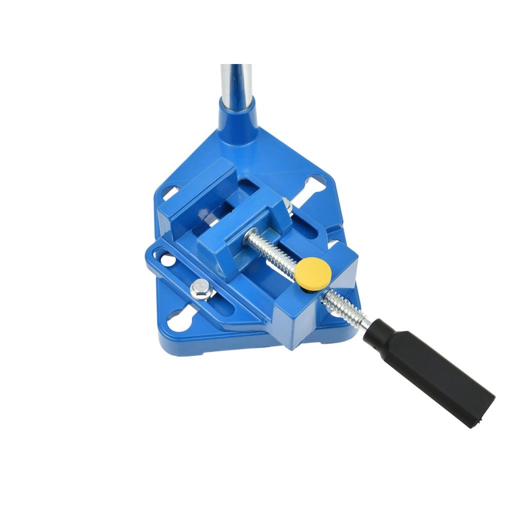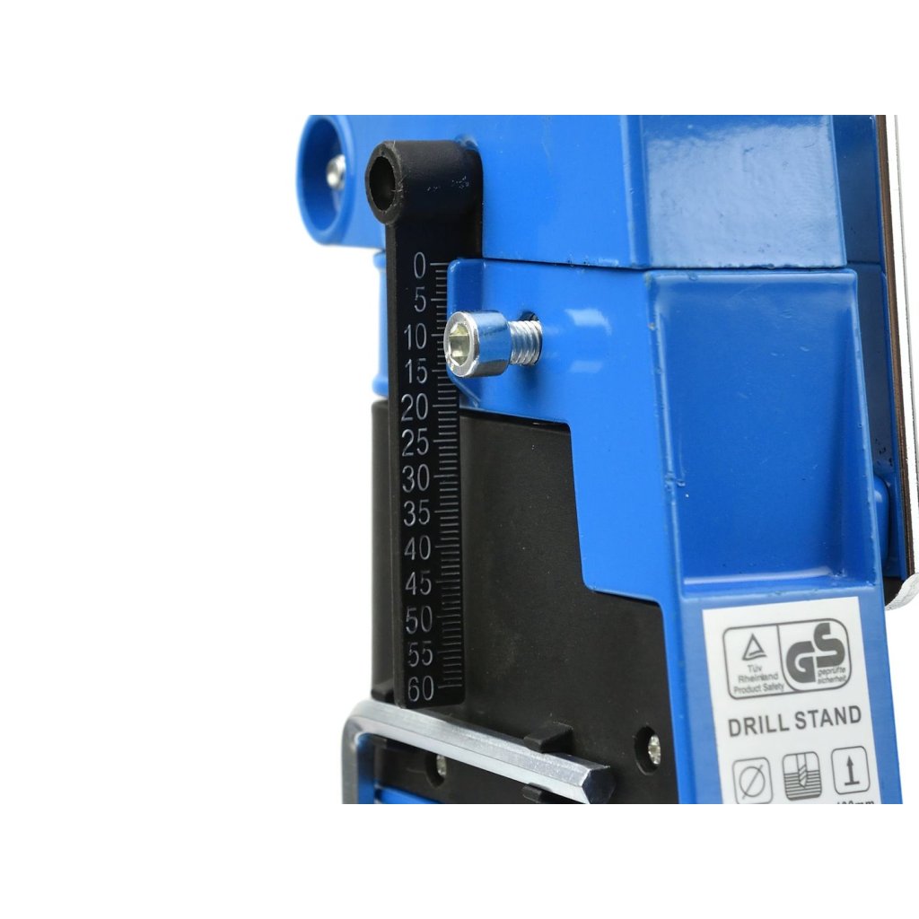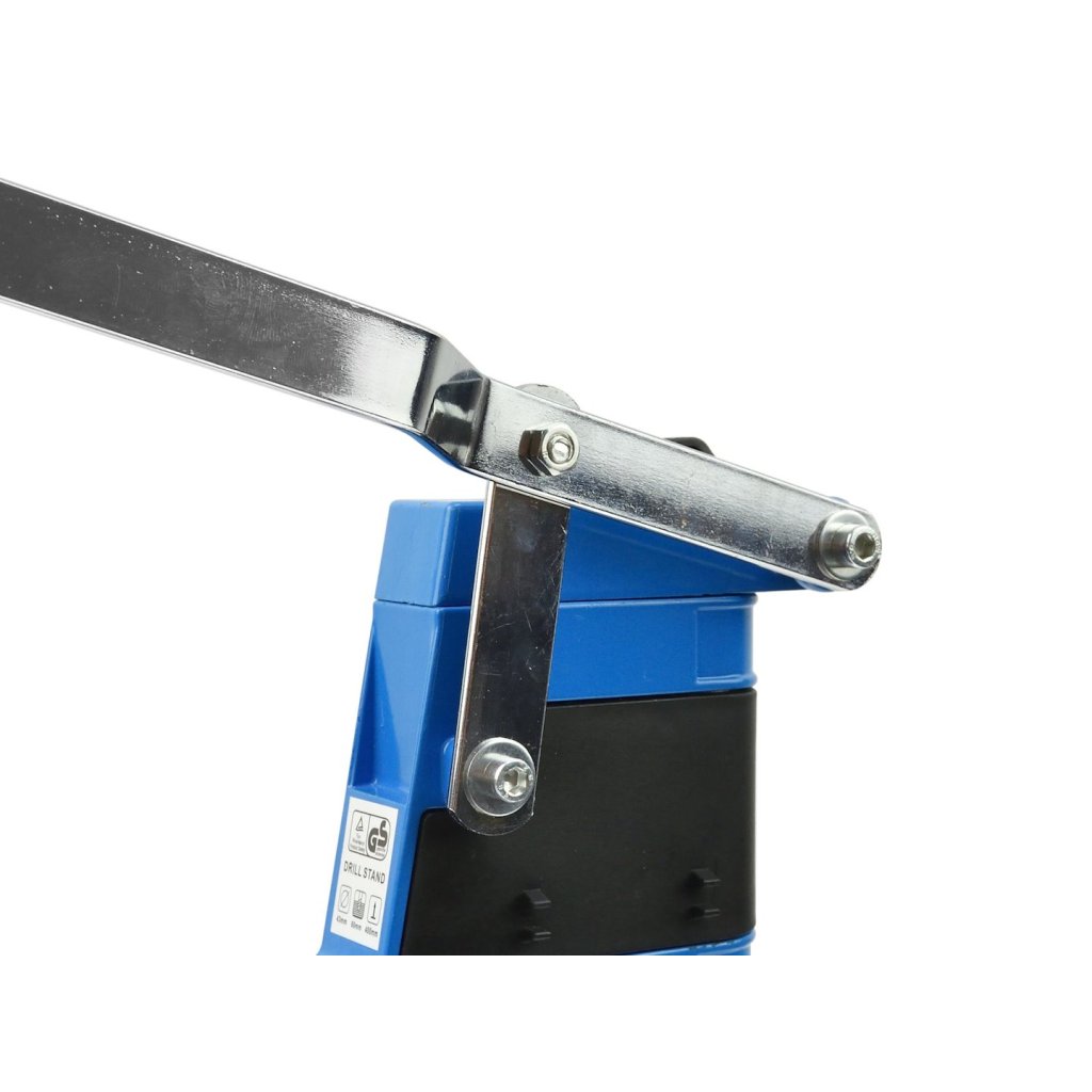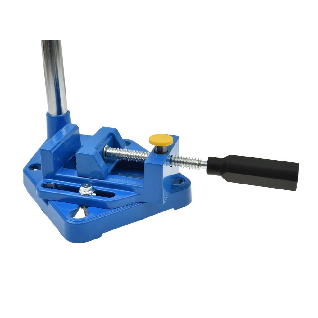 Stojan pro vrtačku se svěrákem. Lehká a pevná konstrukce a pohodlná páka pro ovládání stojanu zajišťují přesnost při vrtání. Použití univerzálního uchycení vrtačky (Euronorm 43 mm) umožňuje upevnění prakticky jakékoli vrtačky do stojanu.