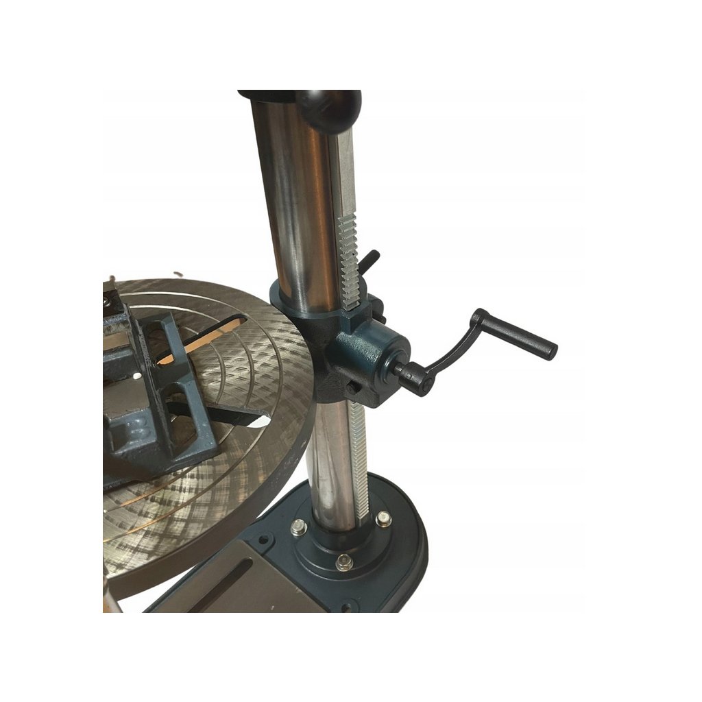 🔧 Obsahuje pěti-stupňovou regulaci otáček, naklápěcí vrtací stůl ±45° a příslušenství pro efektivní vrtání.