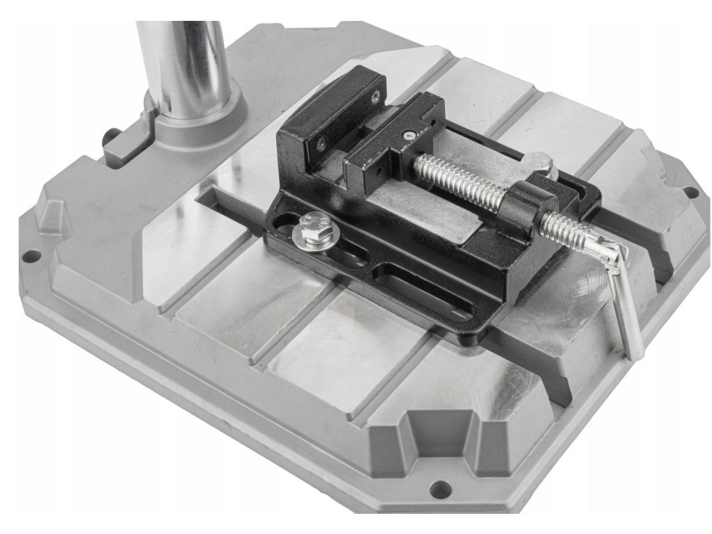Kompaktní stolní sloupová vrtačka 1000 W pro přesné vrtání do kovu i dřeva. Dvourychlostní rozsah otáček 220–2250 ot/min, rychloupínací (samosvorné) sklíčidlo 1,5–13 mm, křížový laser a LED osvětlení. Součástí balení je svěrák pro bezpečné upnutí.