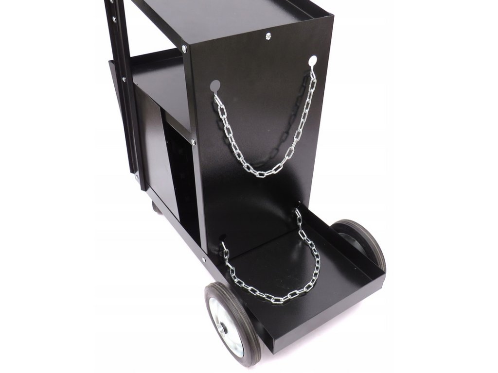 Zadní část vozíku je připravena pro upevnění ochranné láhve s plynem (např. Ar/CO₂). Zajišťovací řetízek/popruh drží láhev pevně u rámu, takže při přemístění nedojde k převážení. Vše má své místo – méně improvizace, více bezpečí. ✅