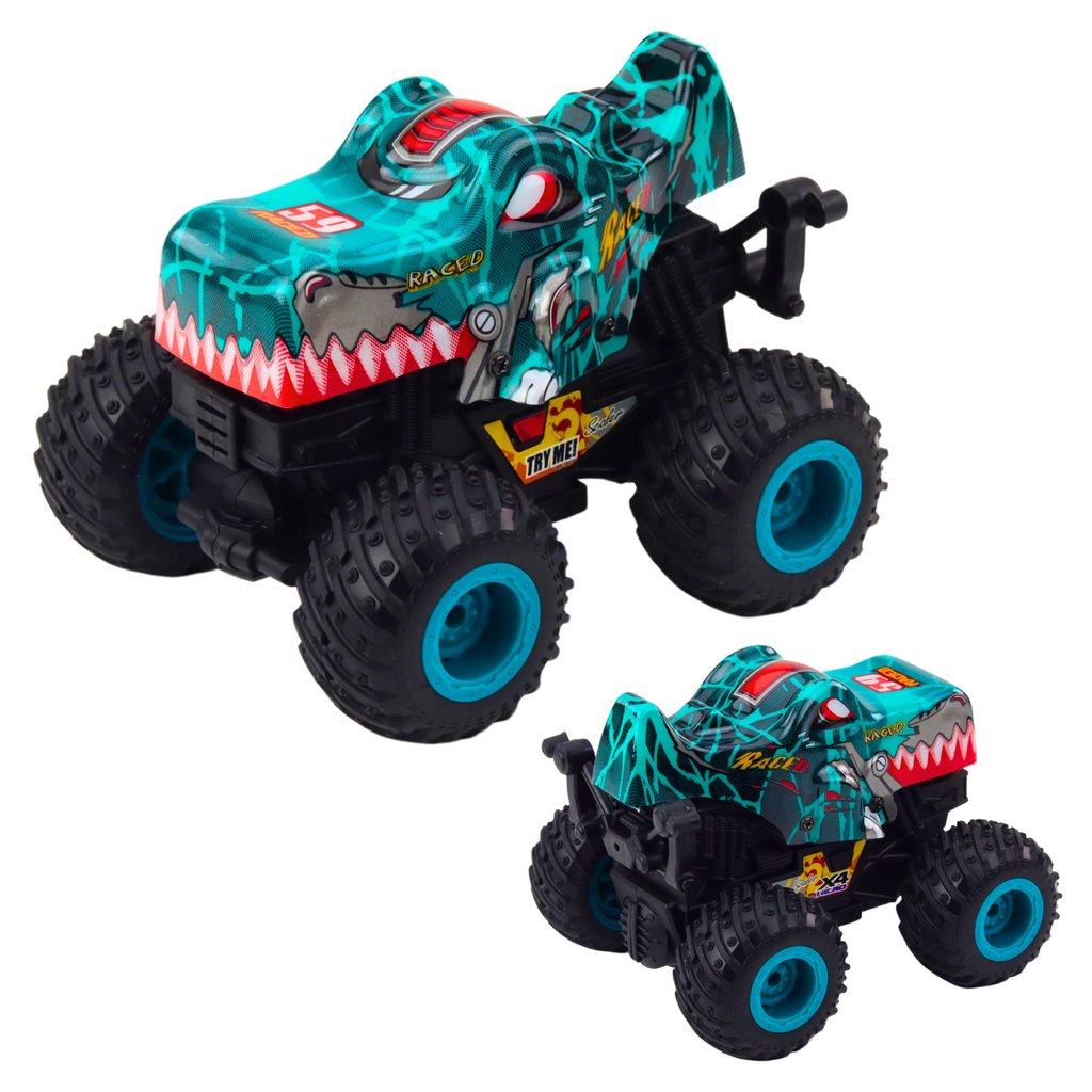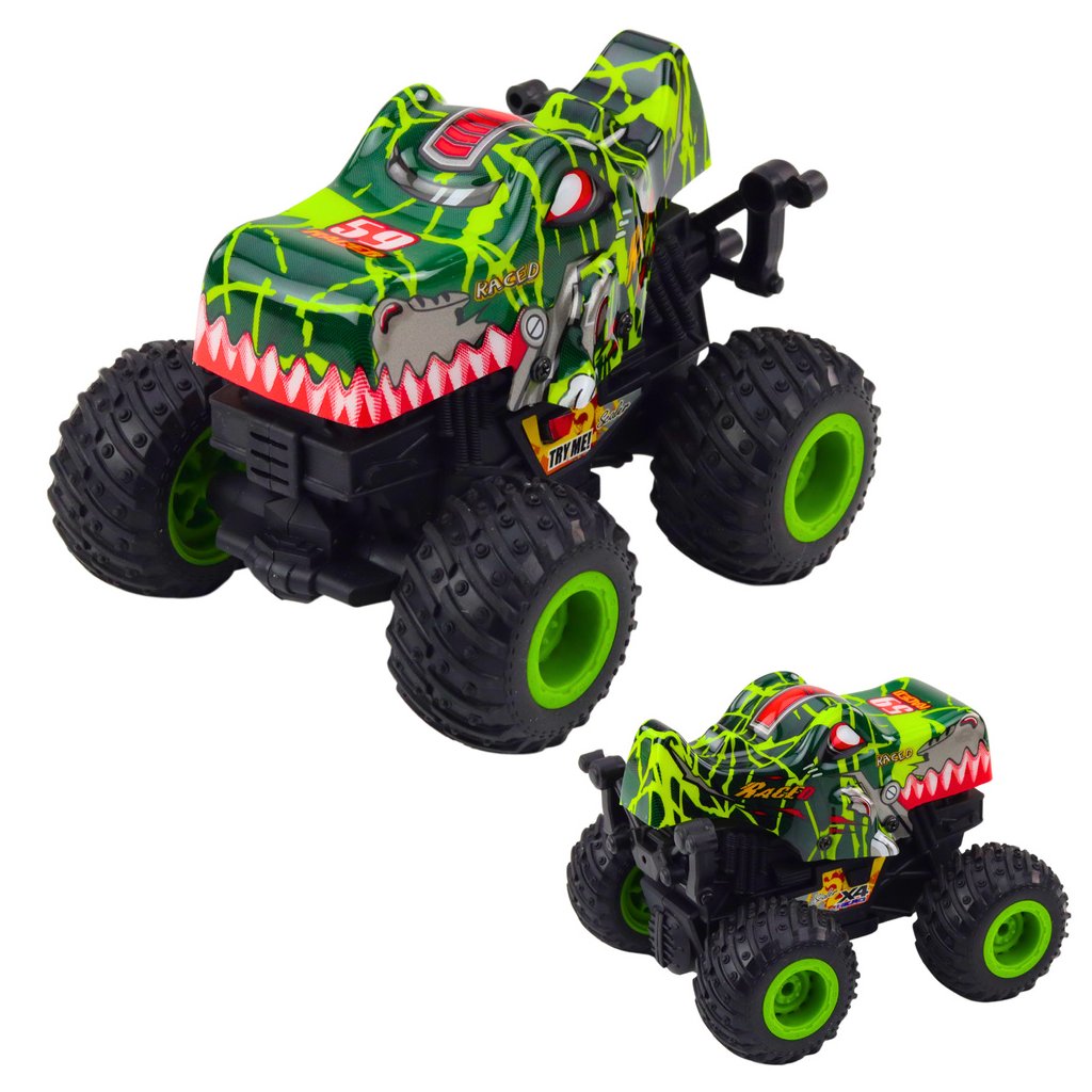 Terénní auto Dino s třecím pohonem, světlem a zvukem je efektní hračka navržena pro děti, které milují extrémní dobrodružství a neobyčejná vozidla Díky unikátnímu vzhledu stylizovanému na divokého tvora a velkým terénním kolům se auto hodí jak pro hru doma, tak i venku
