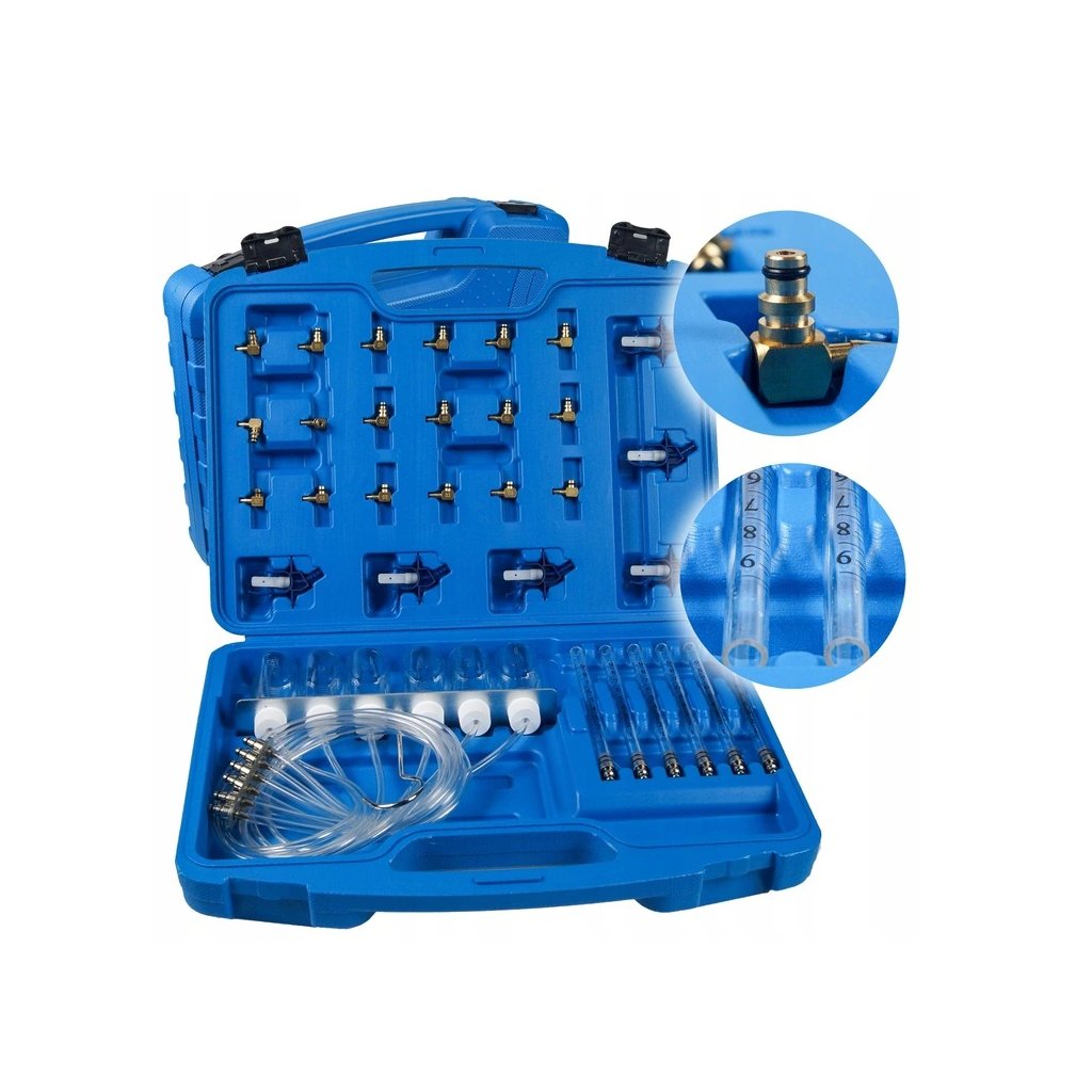 Měření se provádí porovnáním průtoku na zpětném vedení (přepadu) vstřikovačů, na které se přípravek připojí pomocí konektorů. Množství paliva odváděného přepadovým vedením musí být přibližně stejné, v případě velkých rozdílů mezi hladinami v testovacích lahvičkách je na místě důkladná kontrola.