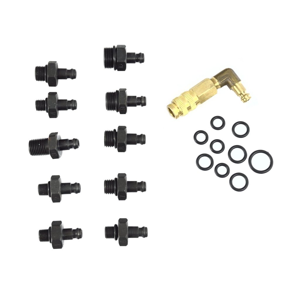 Tester tlaku oleje /rozšířená sada/ Obsah sady Manometr s rozsahem 0–10 bar s ohebnou hadicí L = 1200 mm 10 ks měřicích adaptérů Kolíkový adaptér s rychlospojkou