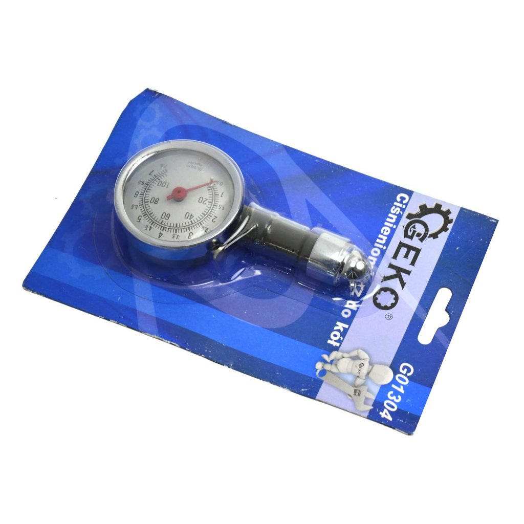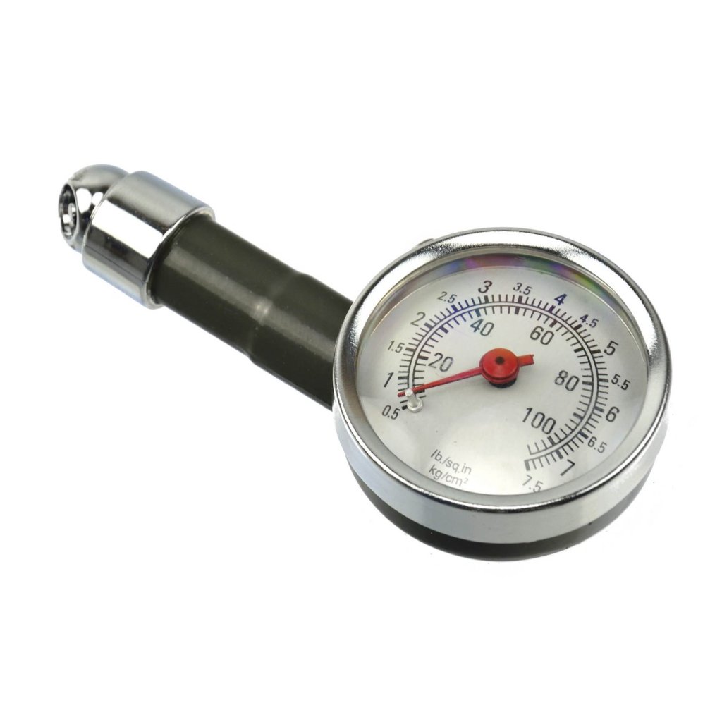 Kapesní tlakoměr pro kontrolu tlaku v pneumatikách automobilů. Malý, lehký a praktický; v kovovém pouzdře.