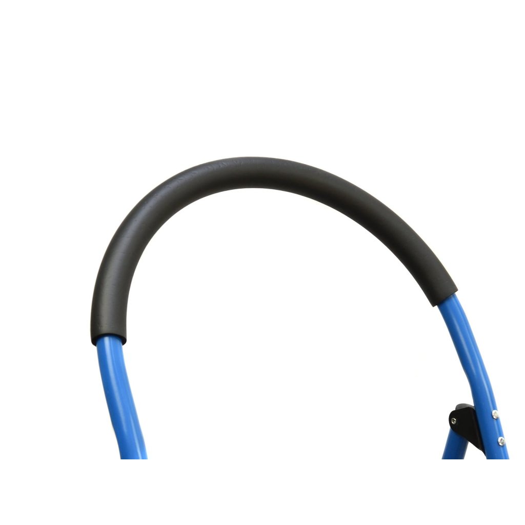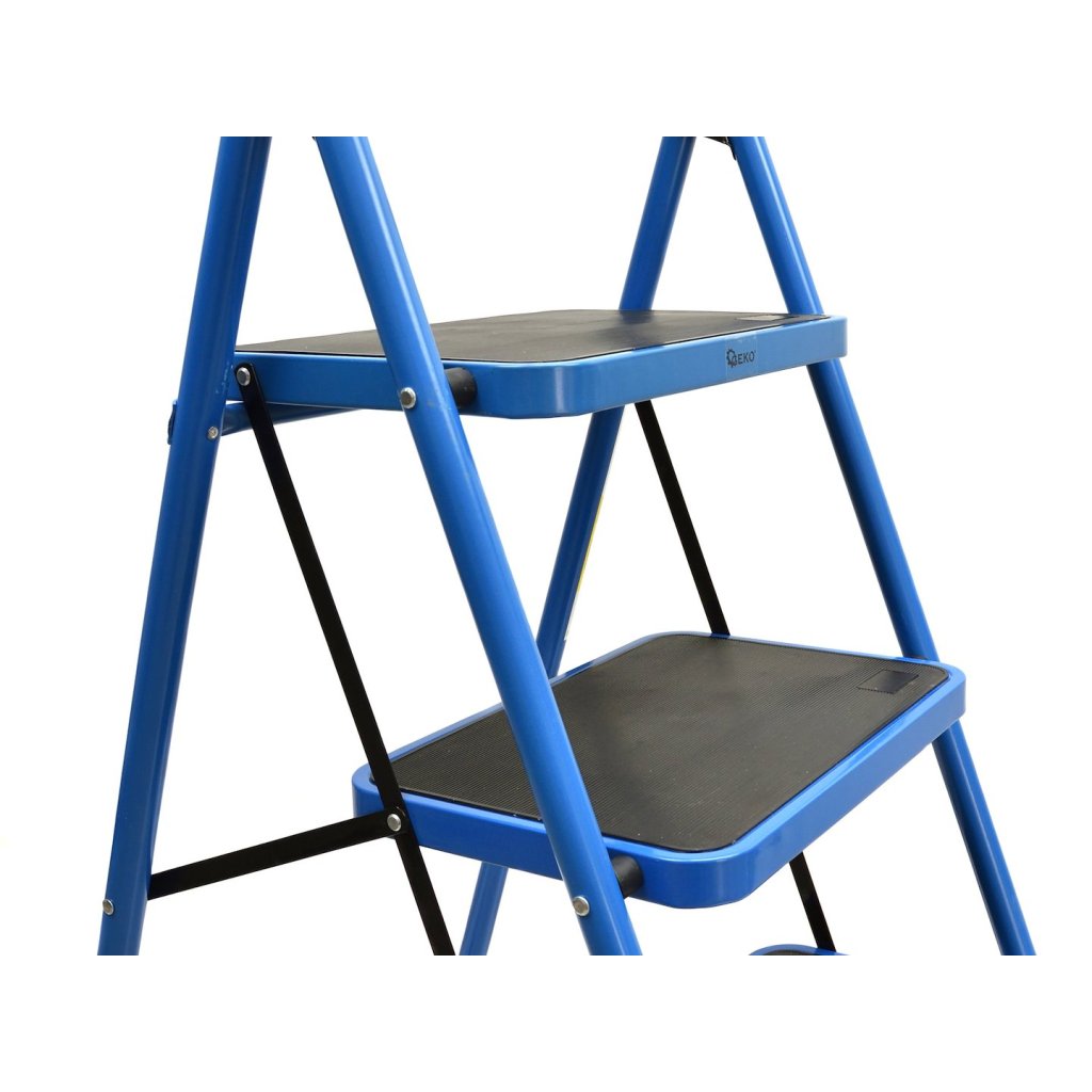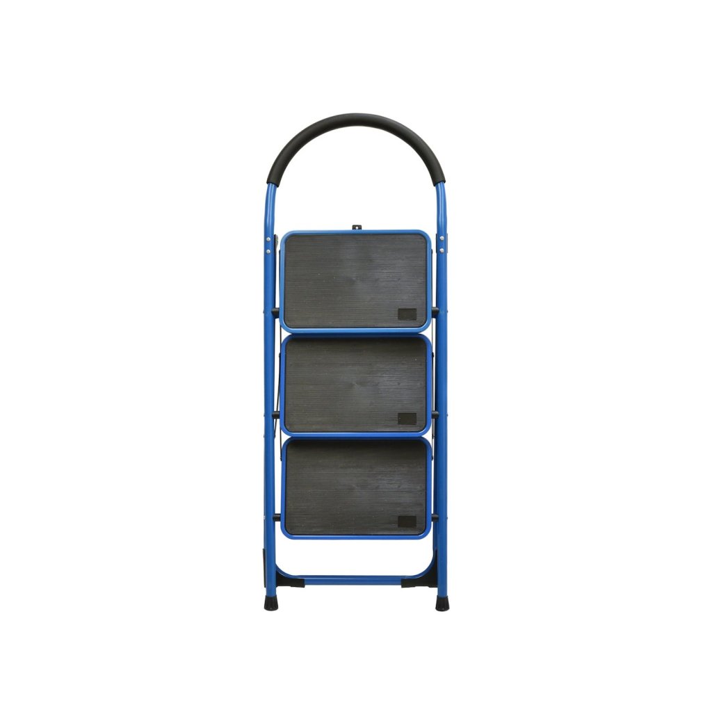 Skládací kovový žebřík se třemi příčkami je praktickým nástrojem pro různé práce ve výškách. Žebřík má modrou barvu a černé prvky, které mu dodávají elegantní vzhled. Každá příčka je pokryta černým, nerovným povrchem, který zajišťuje pohodlí a jistotu při chůzi.
