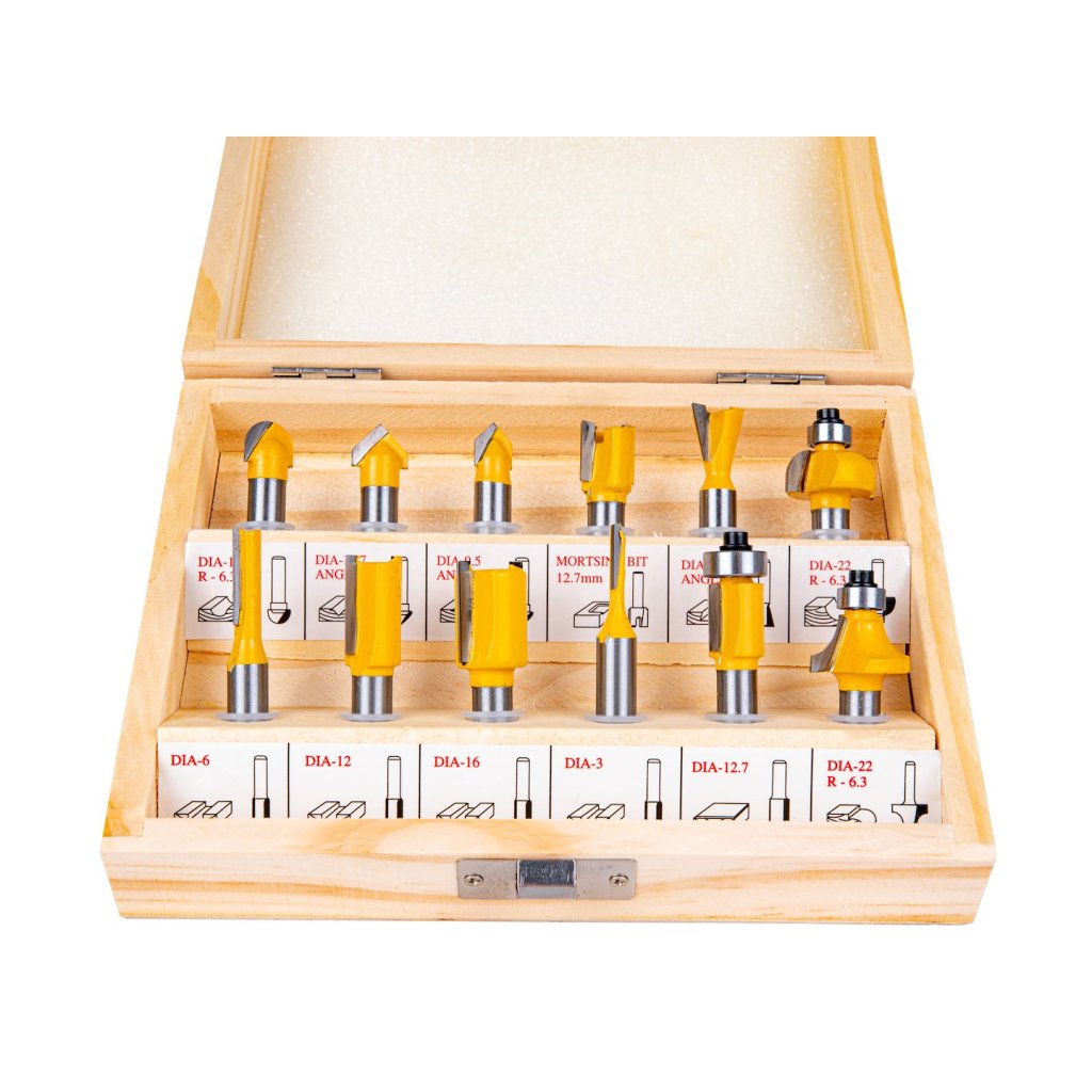 Sada 12 tvarových fréz na dřevo umožňuje přesné opracování materiálu. Čepele z rychlořezné oceli HSS umožňují použití fréz k opracování masivního dřeva, dřevotřísky, MDF a dalších dřevěných materiálů. Použitá ložiska snižují odpor při otáčení, proto jsou frézy ideální pro tvarování oblých materiálů. Celý sada je uložen v praktickém dřevěném kufříku, kde má každá fréza své označené místo.
