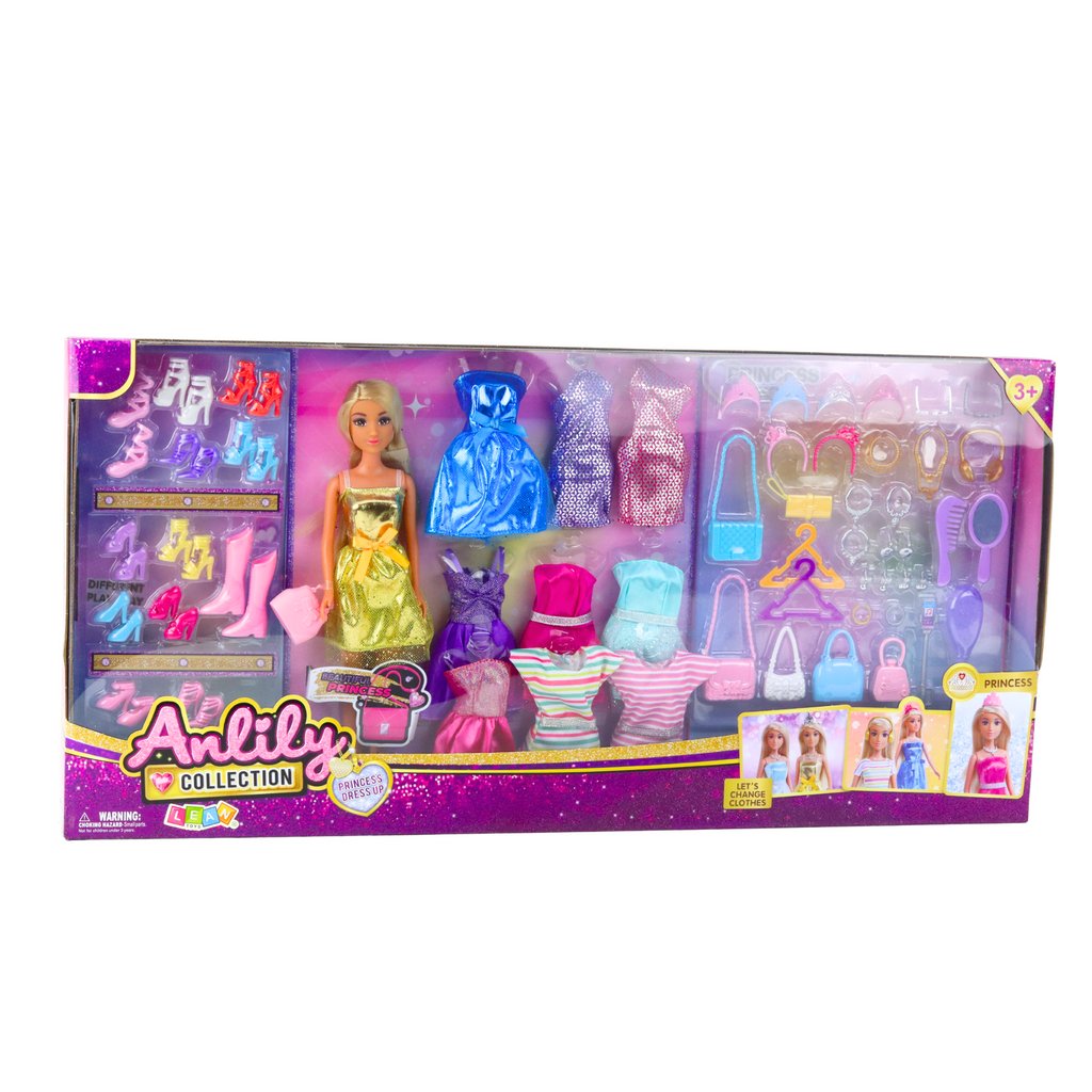 Lalka Anlily s devíti sukněmi, třinácti páry bot a sadou módních doplňků je ideální volbou pro každou dívku, která sní o hraní na stylistku, módní návrhářku nebo modelku Sada obsahuje elegantní panenku s dlouhými blond vlasy, oblečenou do třpytivé zlaté šaty, a dalších devět různě tvarovaných a barevných šatů, které umožňují každodenní vytváření nových módních kombinací