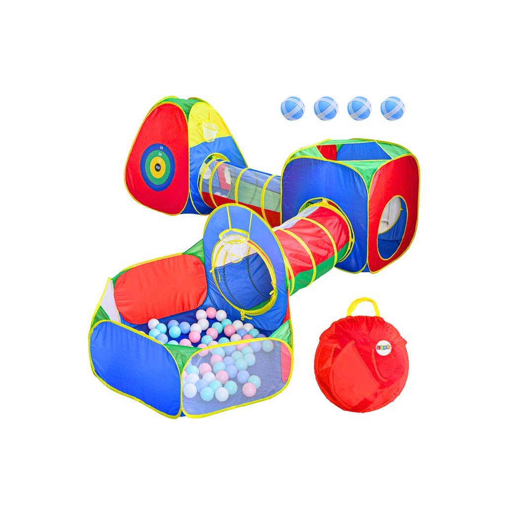 Nejedná se pouze o běžné stany, ale o interaktivní prostor, kde se děti mohou neomezeně vyřádit. Schovávací hry, lezení tunely, házení míčky nebo hra na cíl – to vše je možné. Trojúhelníkový stan je vybaven terčem pro míčky na suchý zip, které jsou zahrnuty v balení, zatímco čtvercový stan nabízí dvě vchody a propojení tunely. Součástí balení je i bazének na míčky s košem na házení.