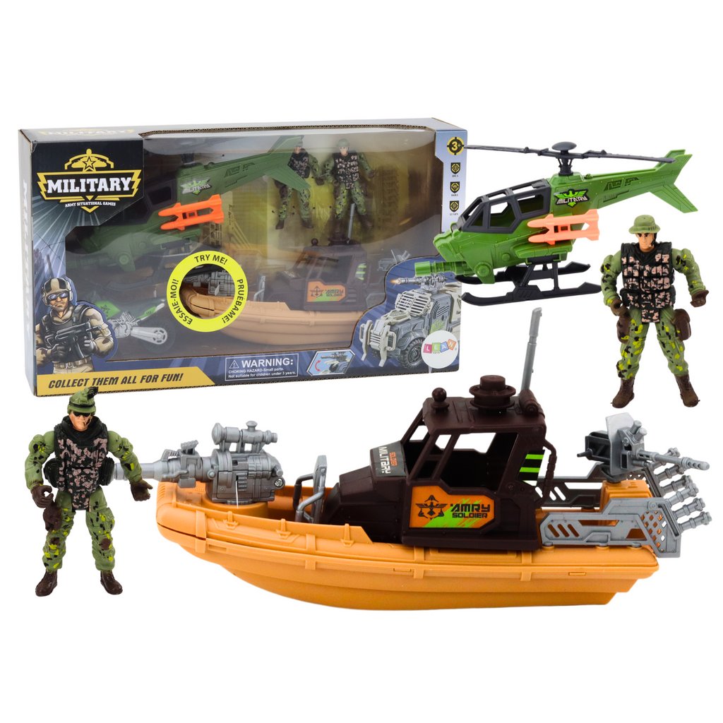 - Tento set zahrnuje figurky vojáků, helikoptéru, terénní motorku a bojovou loď s zvukovými a světelnými efekty, které přenesou malé vojáky do světa napínavých bitev