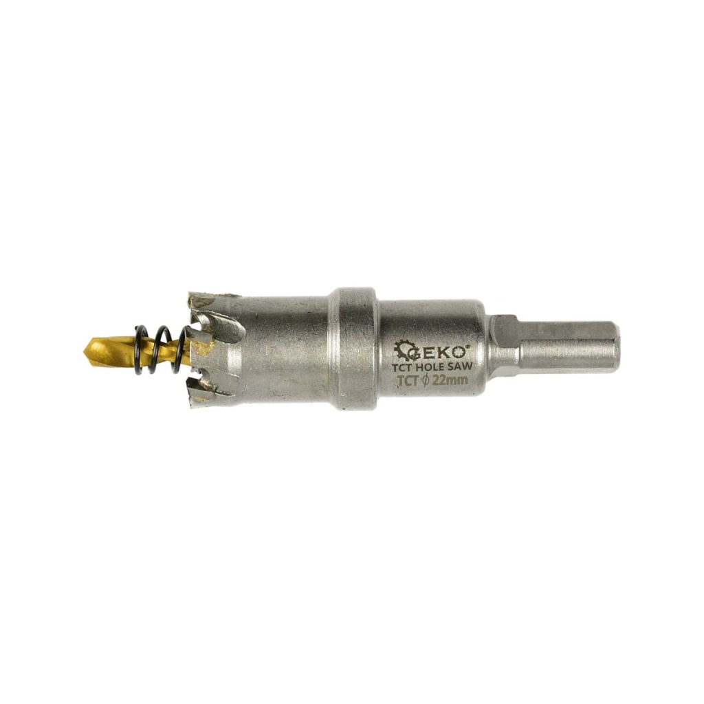 TCTvrták do kovu ovelikosti 22 mm. Břity jsou vyrobeny ze slinutých karbidů, které se vyznačují mnohem větší tvrdostí a odolností vůči vysokým teplotám ve srovnání s rychlořeznou ocelí HSS. Určeno k vrtání otvorů větších průměrů do oceli, litiny, barevných kovů, dřeva, plastů atd. Pro zvýšení přesnosti řezu je použito vodicí vrtáku z oceli HSS. Pružina upevněná na vodicím vrtáku umožňuje snadné odstranění vrtaného materiálu.