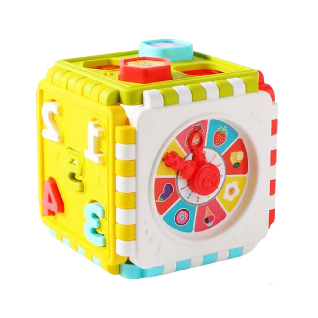 Díky různorodým stěnám s úkoly má dítě mnoho možností k objevování, porovnávání a experimentování Na každé straně kostky se nachází jiná aktivita: hodiny s pohyblivými ručičkami, třídička tvarů a čísel, a také grafiky a prvky stimulující smysly