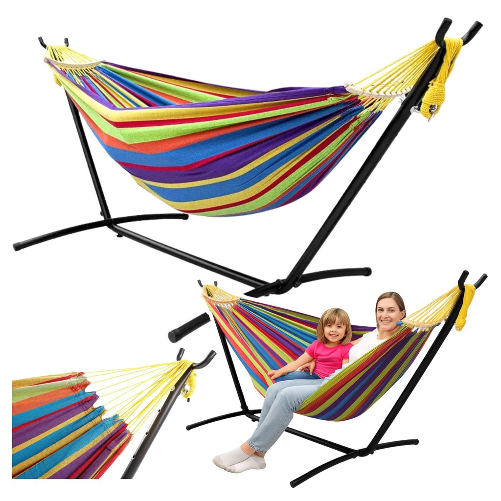 Kompletní sada houpací sítě obsahuje pevný ocelový stojan a velkou, pohodlnou barevnou síť Jedná se o vynikající volbu pro všechny, kteří oceňují komfortní odpočinek na zahradě, terase nebo balkónu