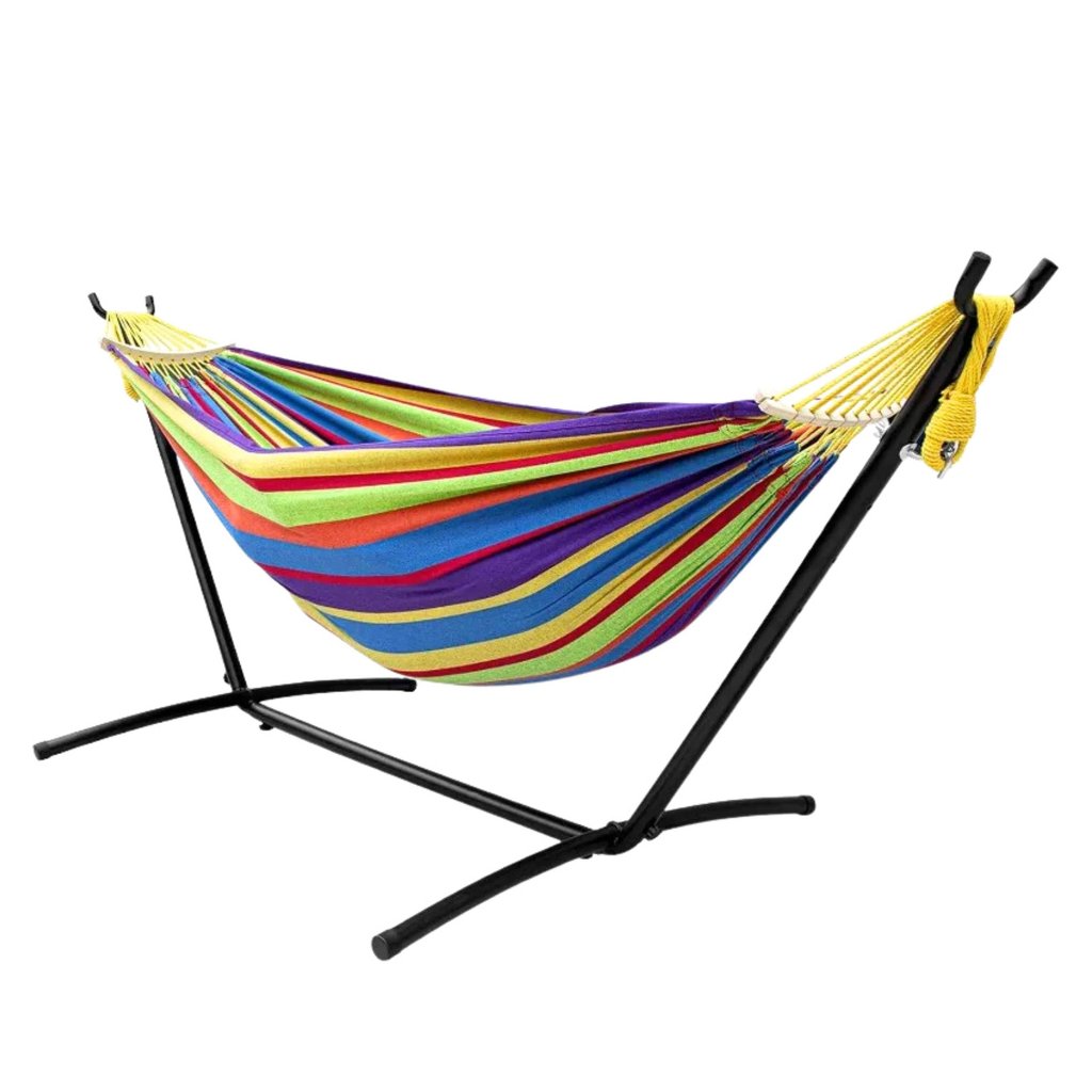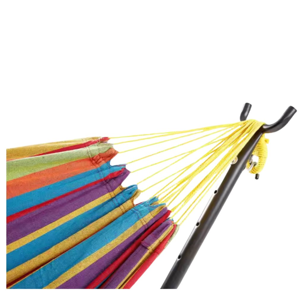 Kompletní sada houpací sítě obsahuje pevný ocelový stojan a velkou, pohodlnou barevnou síť.