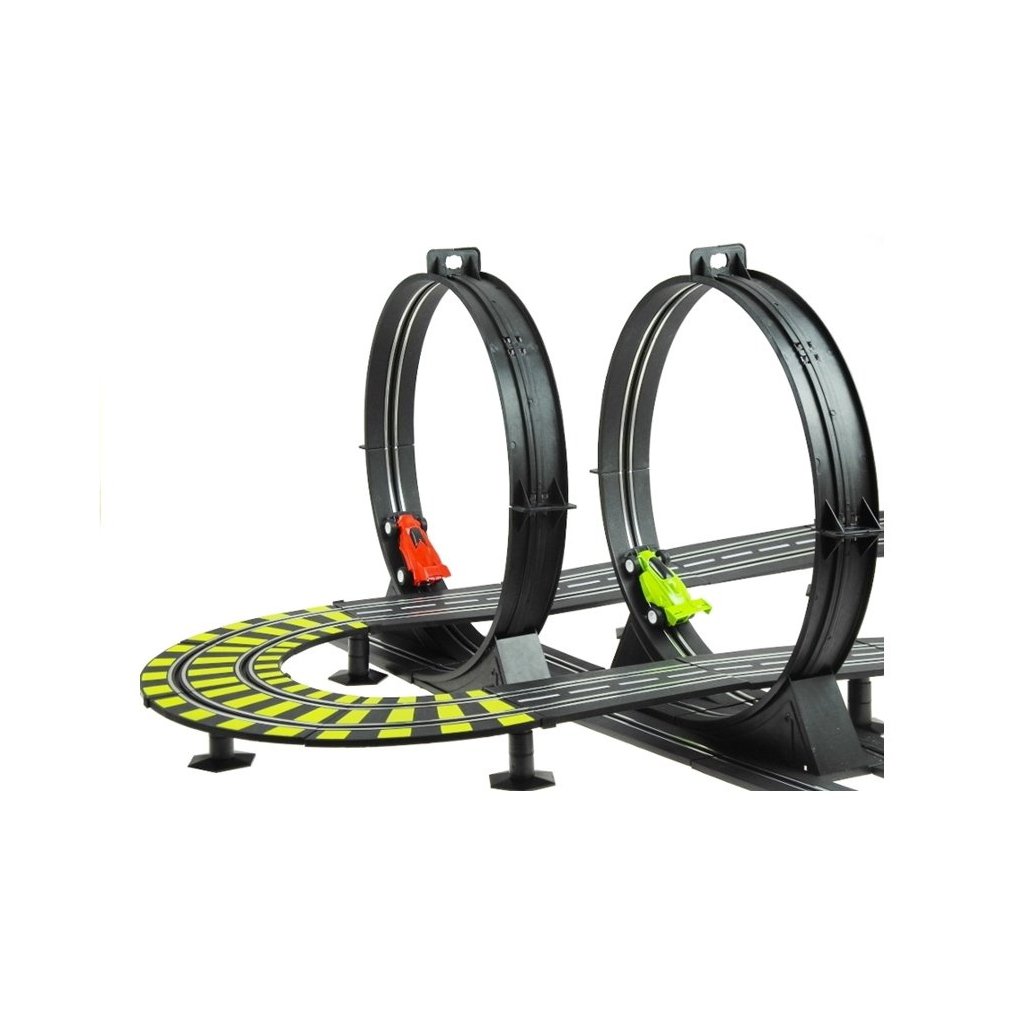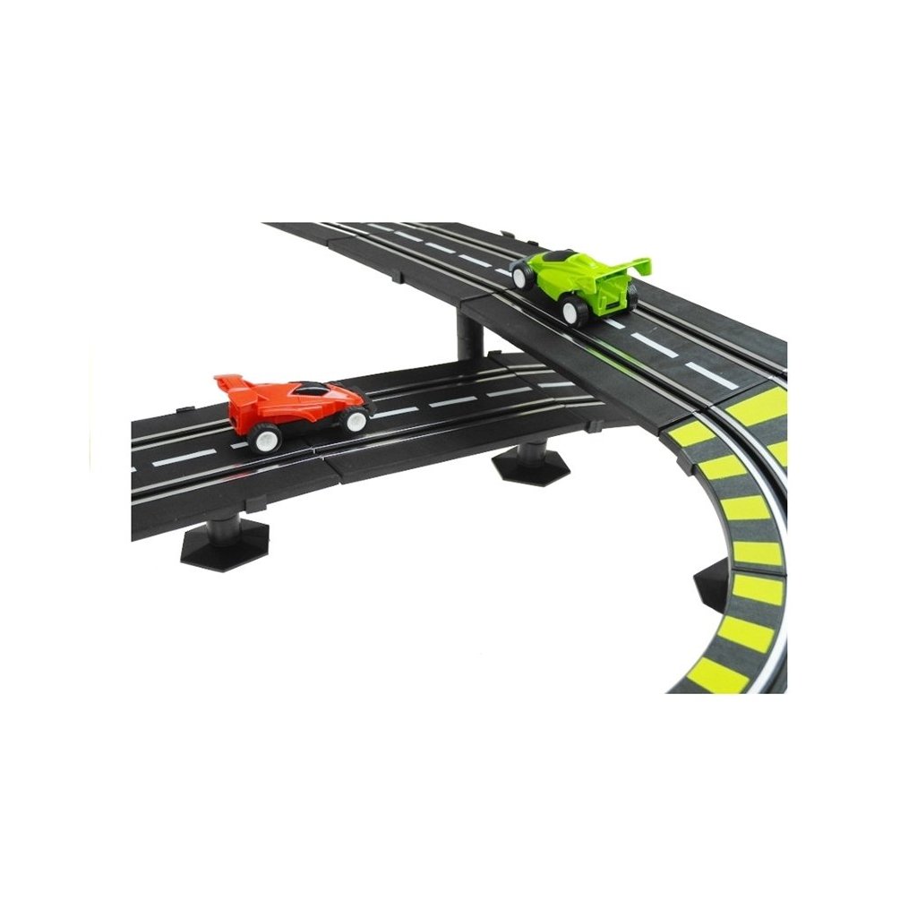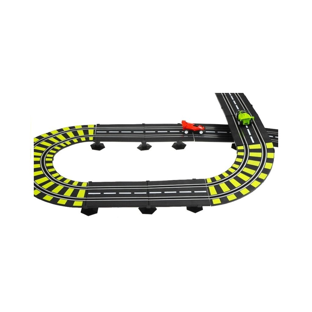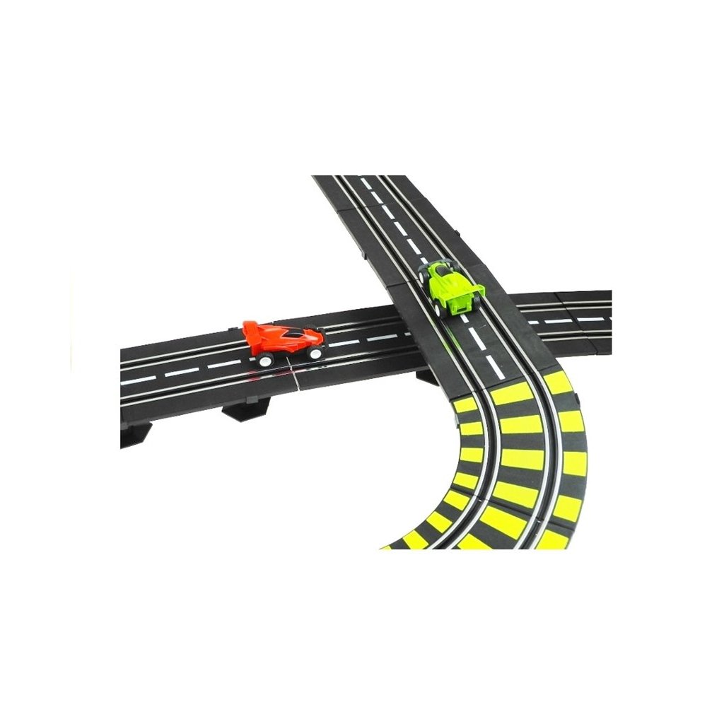 Závodní dráha 11 metrů + 2 autíčka Napájecí zdroj Dráha o délce 1157 cm s okruhy, síťovým napájecím zdrojem 230 V, počítadlem kol, bariérami , které zabraňují vypadnutí autíček, mostem, tribunami a tunelem, „horami“ a „vodopádem“, mezi nimiž se odehrává napínavý závod.