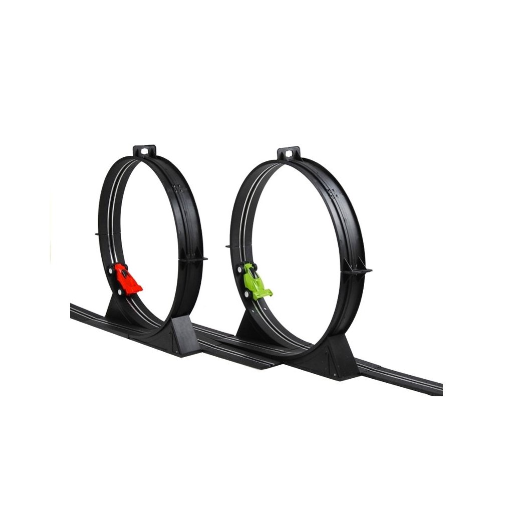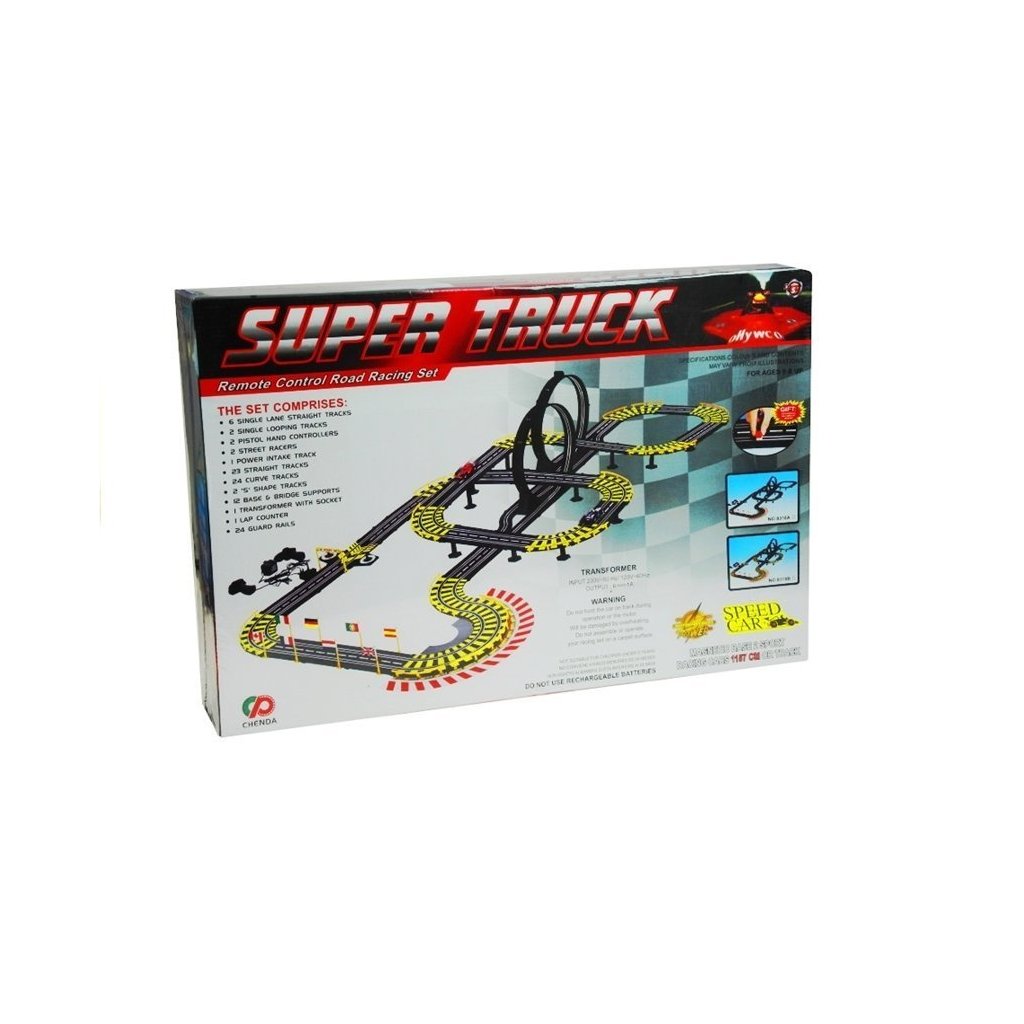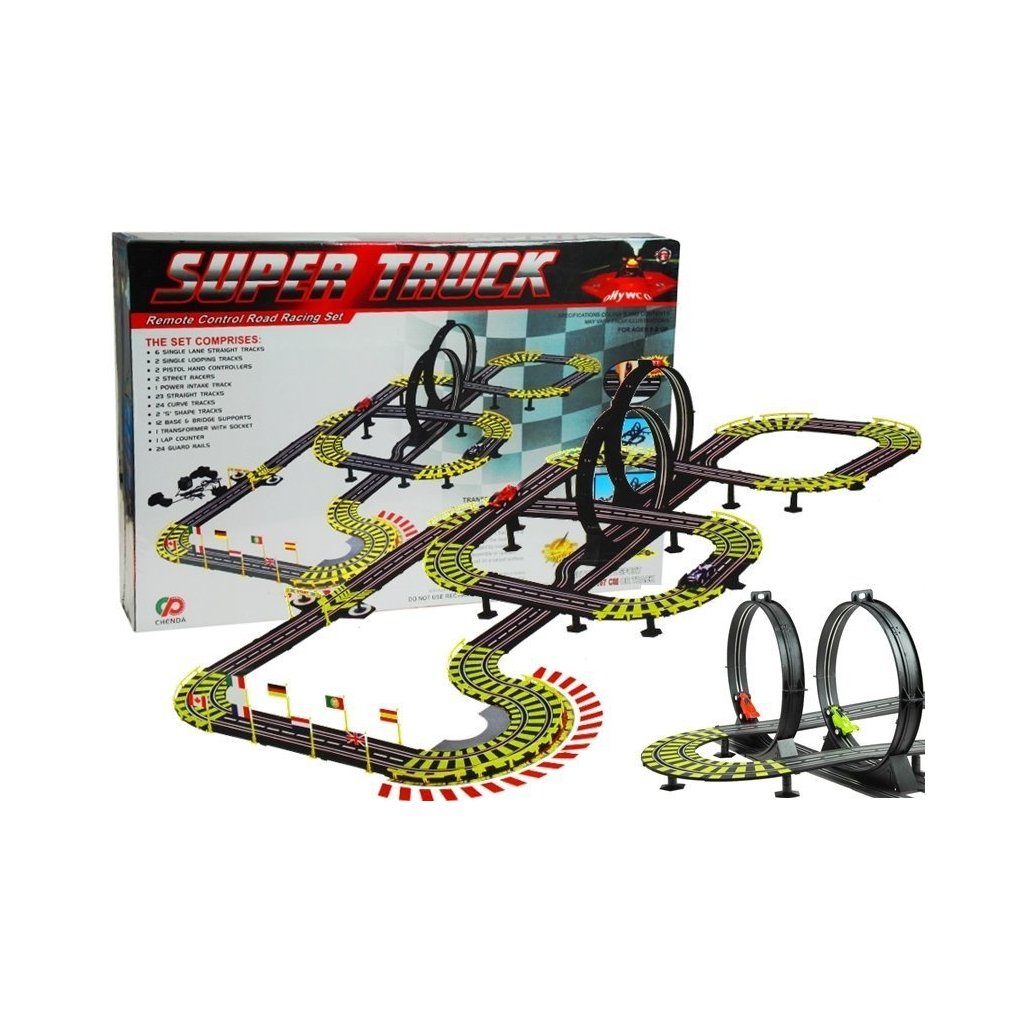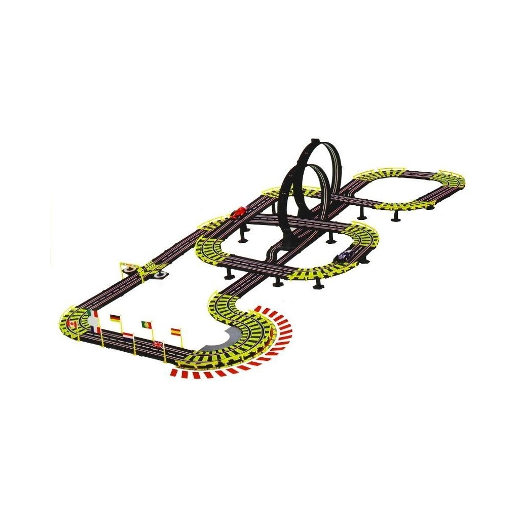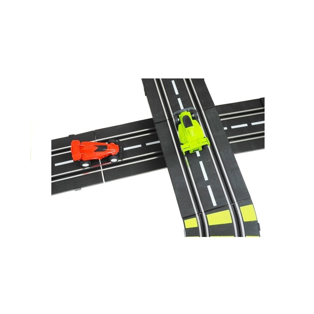 Závodní dráha 11 metrů + 2 autíčka Napájecí zdroj Dráha o délce 1157 cm s okruhy, síťovým napájecím zdrojem 230 V, počítadlem kol, bariérami , které zabraňují vypadnutí autíček, mostem, tribunami a tunelem, „horami“ a „vodopádem“, mezi nimiž se odehrává napínavý závod.